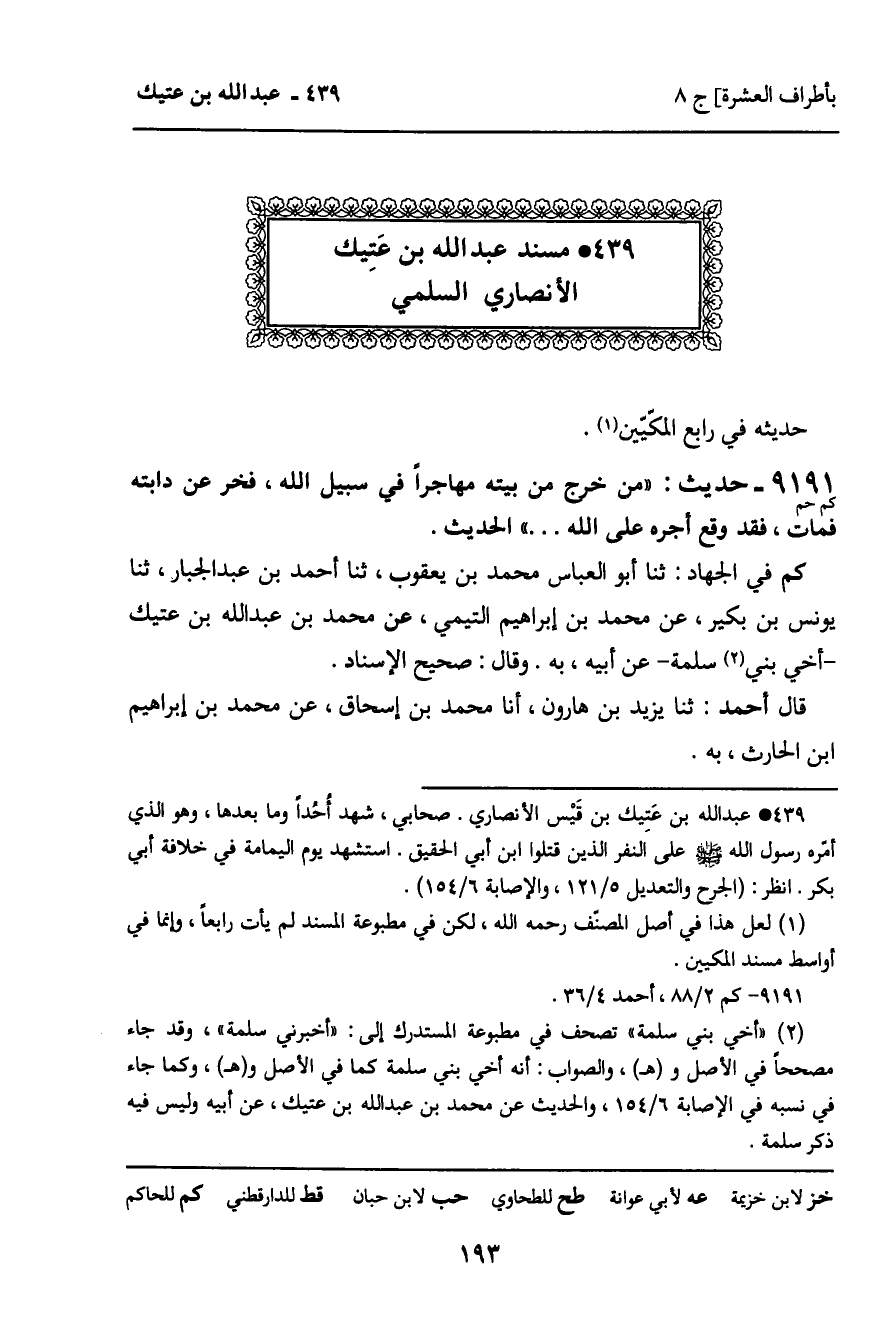 439 ـ مسند عَبْدِ اللَّهِ بْنِ عَتِيكٍ الأَنْصَارِيِّ السُّلَمِيِّ