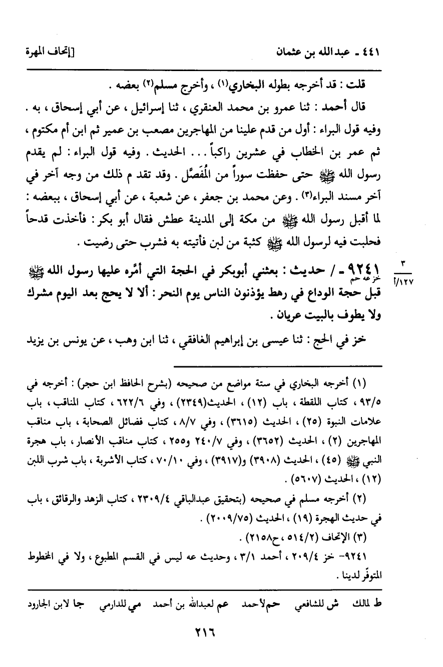 9241 - حَدِيثُ خز حم: " بَعَثَنِي أَبُو بَكْرٍ فِي الْحَجَّةِ الَّتِي أَمَّرَهُ عَلَيْهَا رَسُولُ اللَّهِ صَلَّى اللَّهُ عَلَيْهِ وَسَلَّمَ قَبْلَ حَجَّةِ الْوَدَاعِ فِي رَهَطٍ يُؤَذِّنُونَ النَّاسَ يَوْمَ النَّحْرِ: ألا لا يَحُجُّ بَعْدَ الْيَوْمِ مُشْرِكٌ وَلا يَطُوفُ بِالْبَيْتِ عُرْيَانٌ " الْحَدِيثَ.