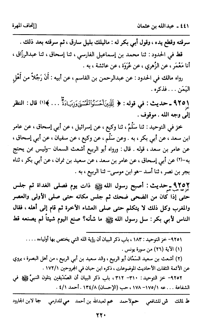 9251 - حَدِيثُ خز: " فِي قَوْلِهِ: لِلَّذِينَ أَحْسَنُوا الْحُسْنَى وَزِيَادَةٌ [سورة: يونس، آية 26] قَالَ: النَّظَرُ إِلَى وَجْهِ اللَّهِ " الْحَدِيثَ مَوْقُوفًا.