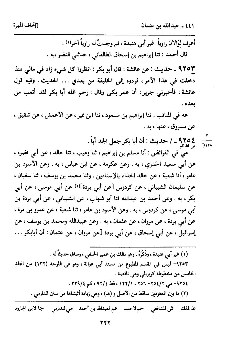 مي فِي الْفَرَائِضِ: أنا مُسْلِمُ بْنُ إِبْرَاهِيمَ، ثنا وُهَيْبٌ، ثنا خَالِدٌ، عَنْ أَبِي نَضْرَةَ، عَنْ أَبِي سَعِيدٍ الْخُدْرِيِّ، بِهِ. وَعَنْ عِكْرِمَةَ، عَنِ ابْنِ عَبَّاسٍ، بِهِ. وَعَنِ الأَسْوَدِ بْنِ عَامِرٍ، أنا شُعْبَةُ، عَنْ خَالِدٍ الْحَذَّاءِ بِالإِسْنَادَيْنِ، وَثنا مُحَمَّدُ بْنُ يُوسُفَ، ثنا سُفْيَانُ، عَنْ سُلَيْمَانَ الشَّيْبَانِيِّ، عَنْ كُرْدُوسٍ، عَنْ أَبِي بُرْدَة، عَنْ أَبِي مُوسَى، عَنْ أَبِي بَكْرٍ، بِهِ. وَعَنْ أَحْمَدَ بْنِ عَبْدِ اللَّهِ، ثنا أَبُو شِهَابٍ، عَنِ الشَّيْبَانِيِّ، عَنْ أَبِي بُرْدَةَ بْنِ أَبِي مُوسَى، عَنْ كُرْدُوسٍ، بِهِ. وَعَنِ الأَسْوَدِ بْنِ عَامِرٍ، ثنا شُعْبَةُ، عَنْ عَمْرِو بْنِ مُرَّةَ، عَنْ أَبِي بُرْدَةَ، عَنْ مَرْوَانَ، عَنْ عُثْمَانَ، بِهِ. وَعَنْ عُبَيْدِ اللَّهِ، وَمُحَمَّدِ بْنِ يُوسُفَ، عَنْ إِسْرَائِيلَ، عَنْ أَبِي إِسْحَاقَ، عَنْ أَبِي بُرْدَةَ، عَنْ مَرْوَانَ، عَنْ عُثْمَانَ: أَنَّ أَبَا بَكْرٍ. . .