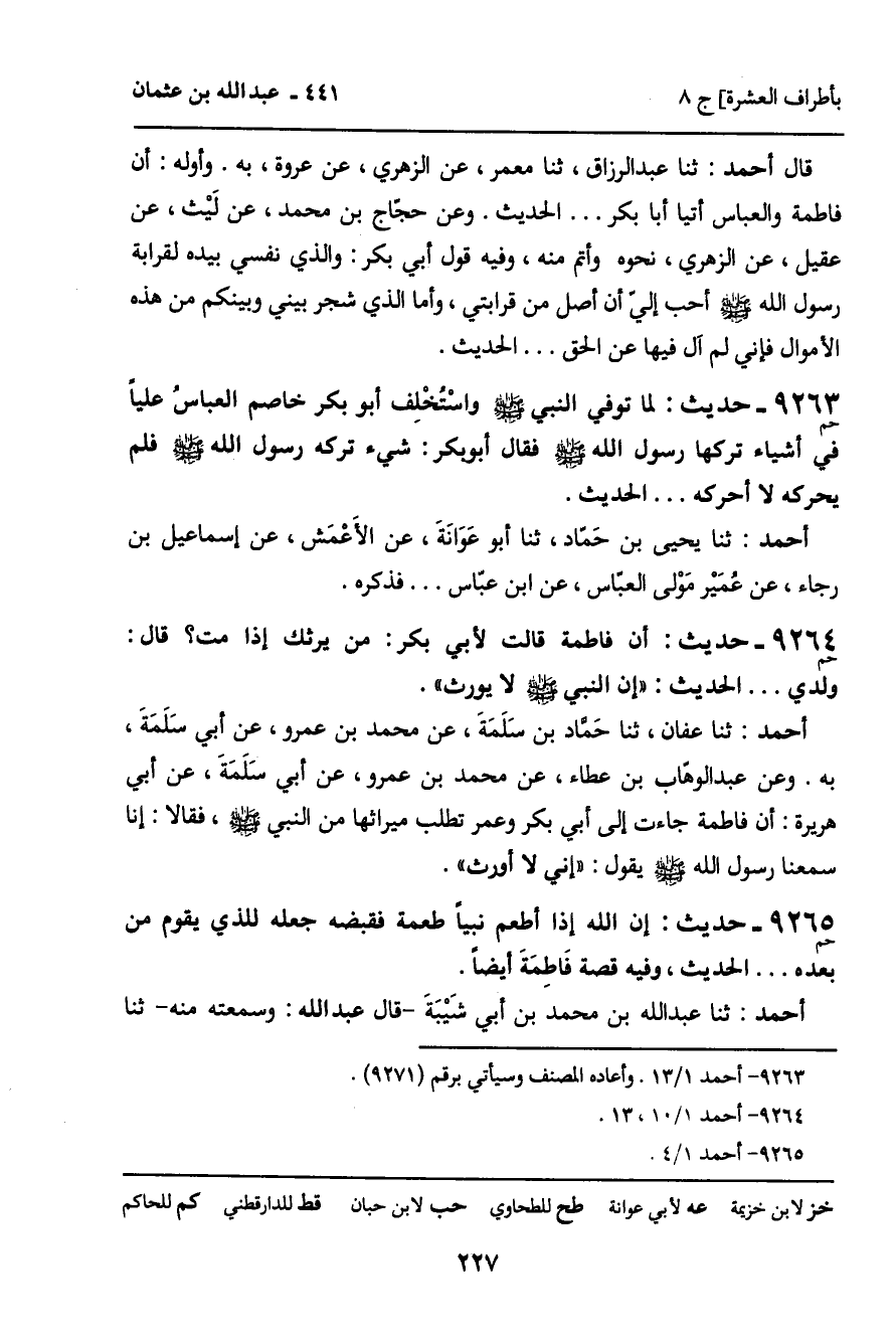 9264 - حَدِيثُ حم: " أَنَّ فَاطِمَةَ قَالَتْ لأَبِي بَكْرٍ: مَنْ يَرِثُكَ إِذَا مِتَّ؟ قَالَ: وَلَدِي. . . " الْحَدِيثَ: " إِنَّ النَّبِيَّ صَلَّى اللَّهُ عَلَيْهِ وَسَلَّمَ لا يُورَثُ ".
