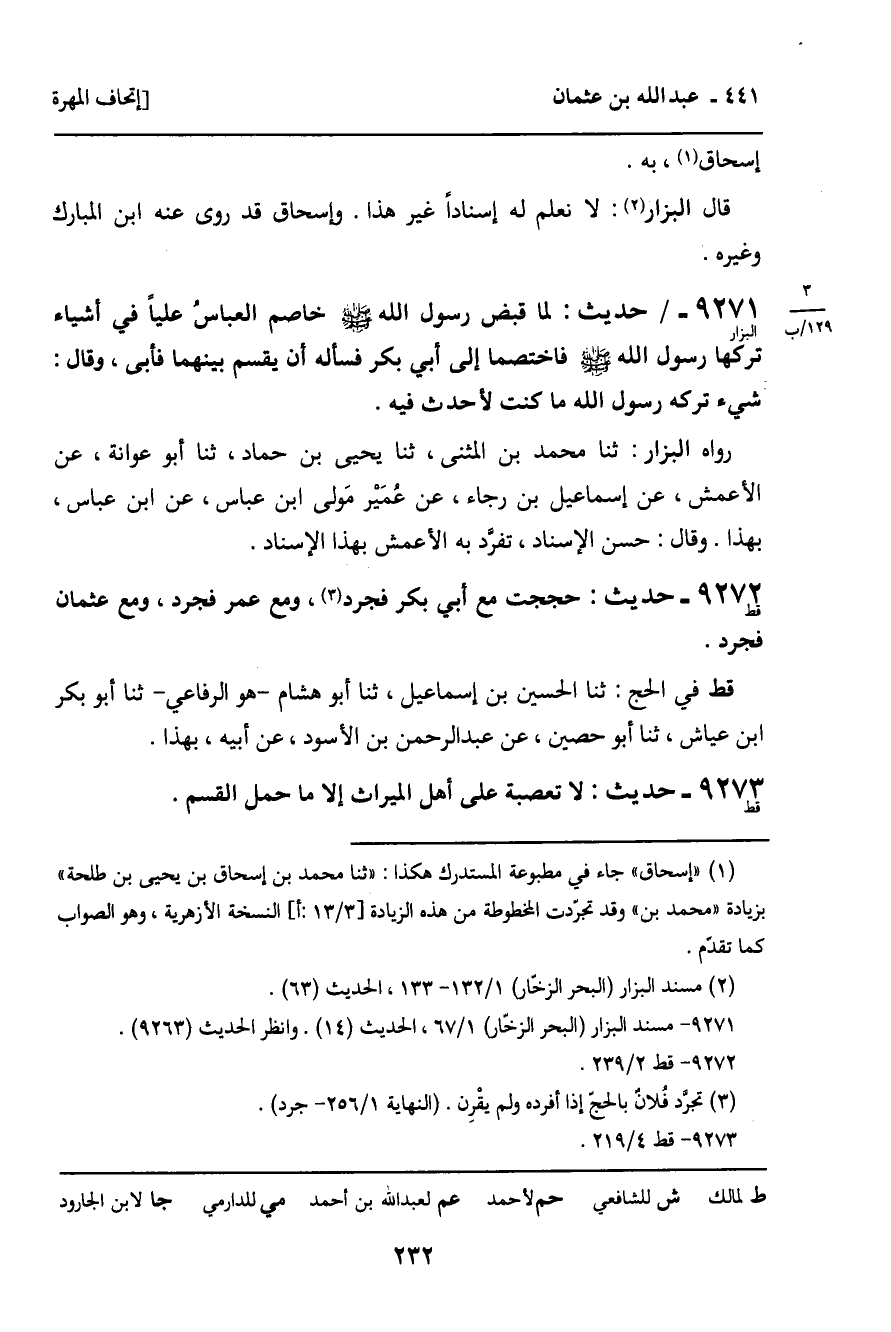 9272 - حَدِيثُ قط: " حَجَجْتُ مَعَ أَبِي بَكْرٍ فَجَرَّدَ، وَمَعَ عُمَرَ فَجَرَّدَ، وَمَعَ عُثْمَانَ فَجَرَّدَ " الْحَدِيثَ.