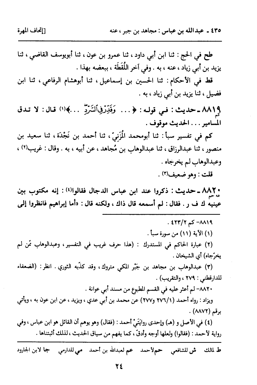 كم فِي تَفْسِيرِ سَبَأٍ: ثنا أَبُو مُحَمَّدٍ الْمُزَنِيُّ، ثنا أَحْمَدُ بْنُ نَجْدَةَ، ثنا سَعِيدُ بْنُ مَنْصُورٍ، ثنا عَبْدُ الرَّزَّاقِ، ثنا عَبْدُ الْوَهَّابِ بْنُ مُجَاهِدٍ، عَنْ أَبِيهِ، بِهِ. وَقَالَ: غَرِيبٌ، وَعَبْدُ الْوَهَّابِ لَمْ يُخَرِّجَاهُ.