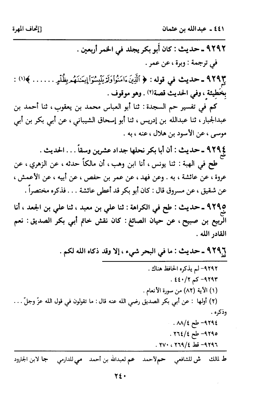 9292 - حَدِيثُ: " كَانَ أَبُو بَكْرٍ يَجْلِدُ فِي الْخَمْرِ أَرْبَعِينَ " الْحَدِيثَ.