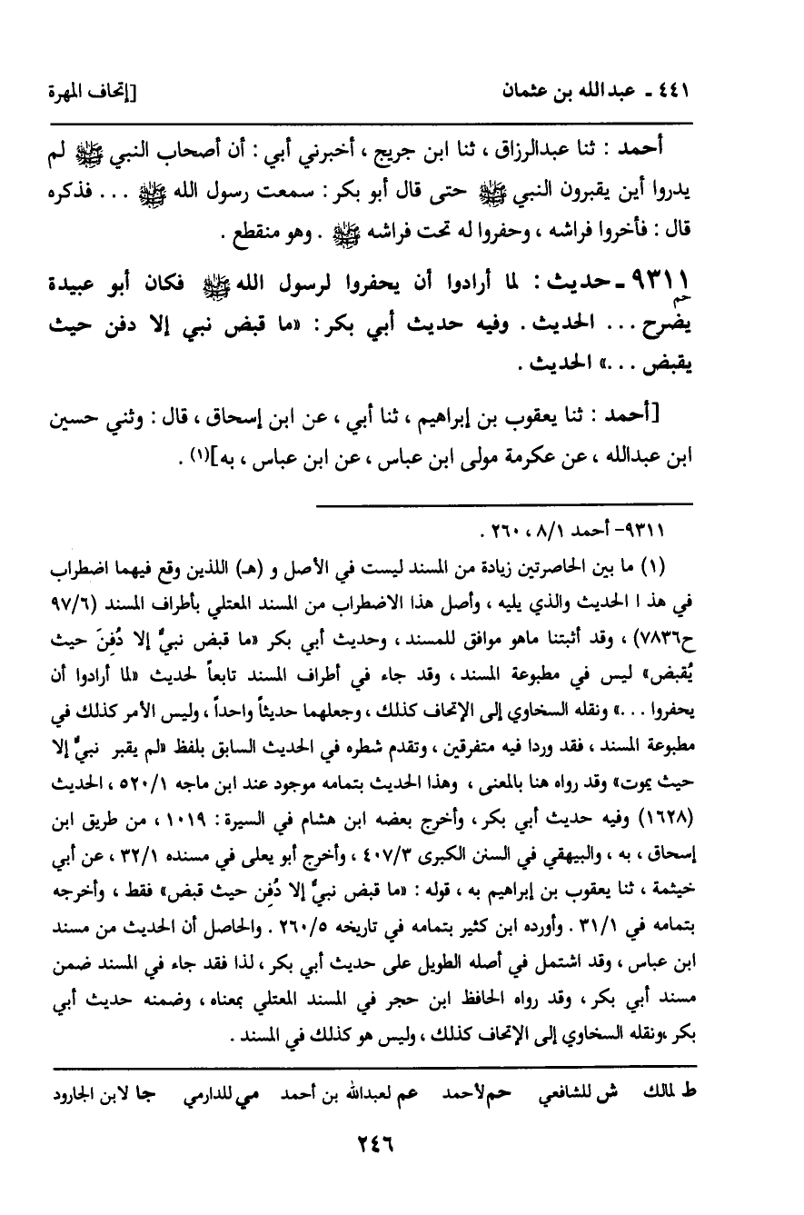 9311 - حَدِيثُ حم: " لَمَّا أَرَادُوا أَنْ يَحْفِرُوا لِرَسُولِ اللَّهِ صَلَّى اللَّهُ عَلَيْهِ وَسَلَّمَ فَكَانَ أَبُو عُبَيْدَةَ يَضْرَحُ. . . " الْحَدِيثَ. وَفِيهِ حَدِيثُ أَبِي بَكْرٍ: " مَا قُبِضَ نَبِيٌّ إِلا دُفِنَ حَيْثُ يُقْبَضُ. . . " الْحَدِيثَ.