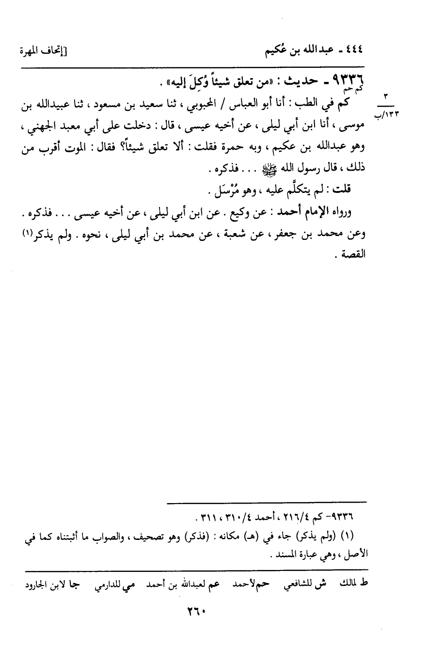 9336 - حَدِيثُ كم حم: " مَنْ تَعَلَّقَ شَيْئًا وُكِلَ إِلَيْهِ " الْحَدِيثَ.