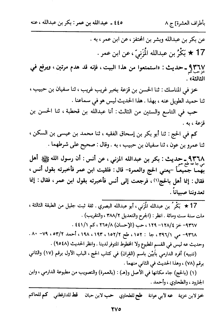 9368 - حَدِيثُ مي جا حم: " بَكْرُ بْنُ عَبْدِ اللَّهِ الْمُزَنِيُّ، عَنْ أَنَسٍ أَنَّ رَسُولَ اللَّهِ صَلَّى اللَّهُ عَلَيْهِ وَسَلَّمَ أَهَلَّ بِهِمَا جَمِيعًا، يَعْنِي: الْحَجَّ وَالْعُمْرَةَ، قَالَ: فَلَقِيتُ ابْنَ عُمَرَ فَأَخْبَرْتُهُ بِقَوْلِ أَنَسٍ، فَقَالَ: إِنَّمَا أَهَلَّ بِالْحَجِّ، فَرَجَعْتُ إِلَى أَنَسٍ، فَأَخْبَرْتُهُ بِقَوْلِ ابْنِ عُمَرَ، فَقَالَ: إِنَّمَا تَعُدُّونَنَا صِبْيَانًا. " الْحَدِيثَ.