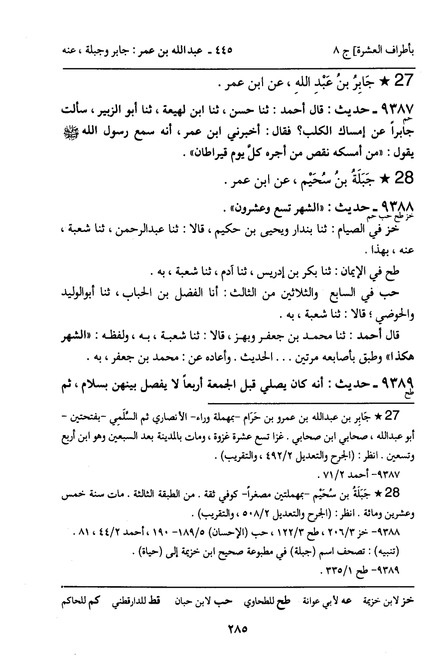 9388 - حَدِيثُ خز حب حم: " الشَّهْرُ تِسْعٌ وَعِشْرُونَ " الْحَدِيثَ.