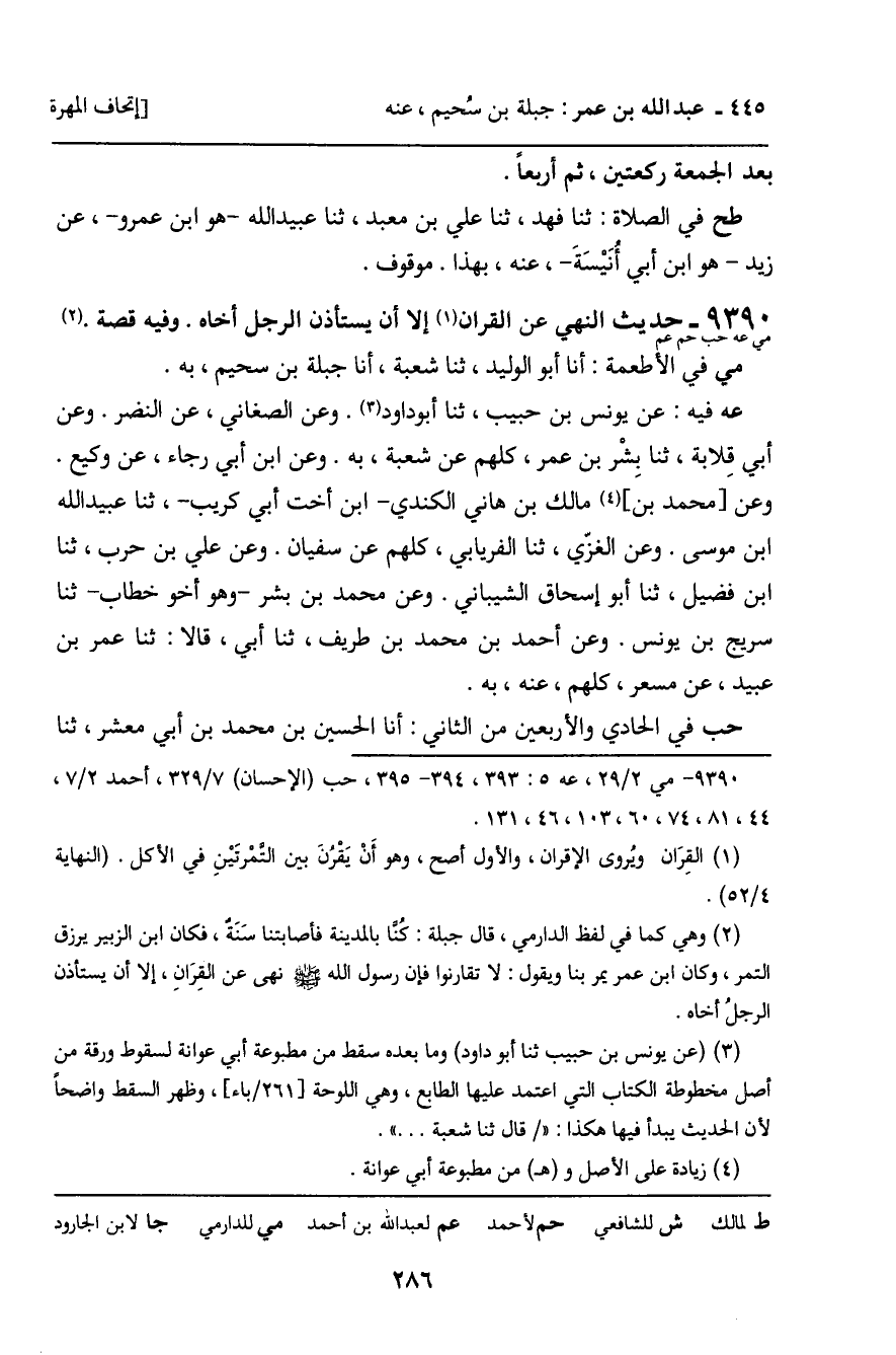 9390 - حَدِيثُ مي حب حم عم: " النَّهْيُ عَنِ الْقِرَانِ إِلا أَنْ يَسْتَأْذِنَ الرَّجُلُ أَخَاهُ " الْحَدِيثَ. وَفِيهِ قِصَّةٌ.