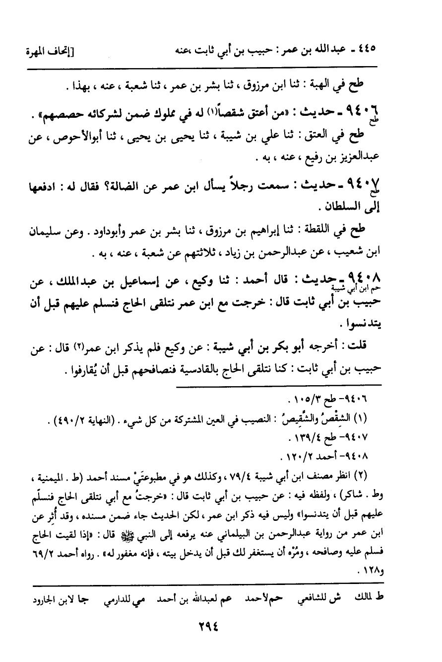9408 - حَدِيثُ حم ابْنِ أَبِي شَيْبَةَ: " قَالَ أَحْمَدُ: ثنا وَكِيعٌ، عَنْ إِسْمَاعِيلَ بْنِ عَبْدِ الْمَلِكِ، عَنْ حَبِيبِ بْنِ أَبِي ثَابِتٍ، قَالَ: خَرَجْتُ مَعَ ابْنِ عُمَرَ نَتَلَقَّى الْحَاجَّ فَنُسَلِّمُ عَلَيْهِمْ قَبْلَ أَنْ يَتَدَنَّسُوا " الْحَدِيثَ.