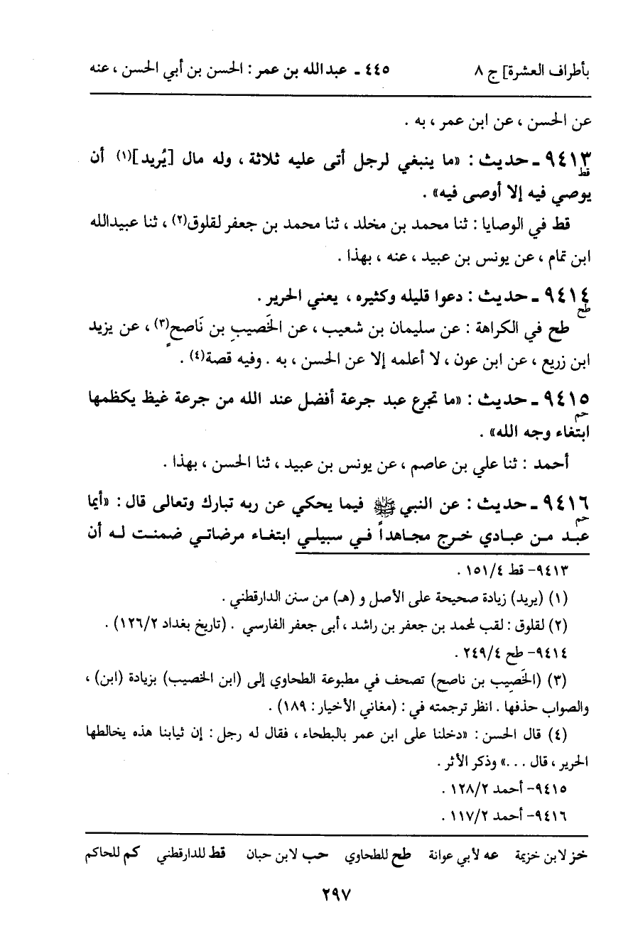 9413 - حَدِيثُ قط: " مَا يَنْبَغِي لِرَجُلٍ أَتَى عَلَيْهِ ثَلاثَةٌ، وَلَهُ مَالٌ يُرِيدُ أَنْ يُوصِيَ فِيهِ إِلا أَوْصَى فِيهِ " الْحَدِيثَ.