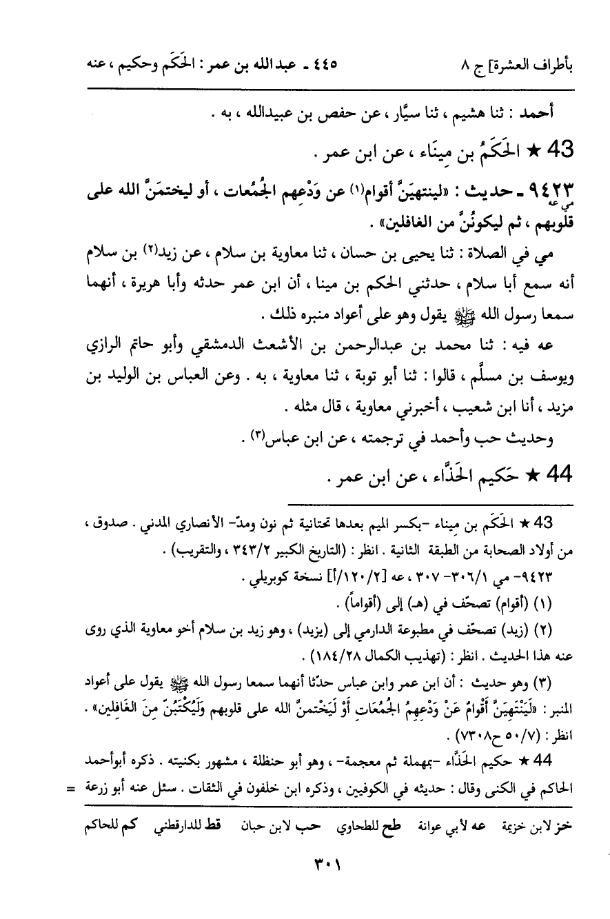 9423 - حَدِيثُ مي: " لَيَنْتَهِيَنَّ أَقْوَامٌ عَنْ وَدْعِهِمُ الْجُمُعَاتِ، أَوْ لَيَخْتِمَنَّ اللَّهُ عَلَى قُلُوبِهِمْ، ثُمَّ لَيَكُونَنَّ مِنَ الْغَافِلِينَ " الْحَدِيثَ.