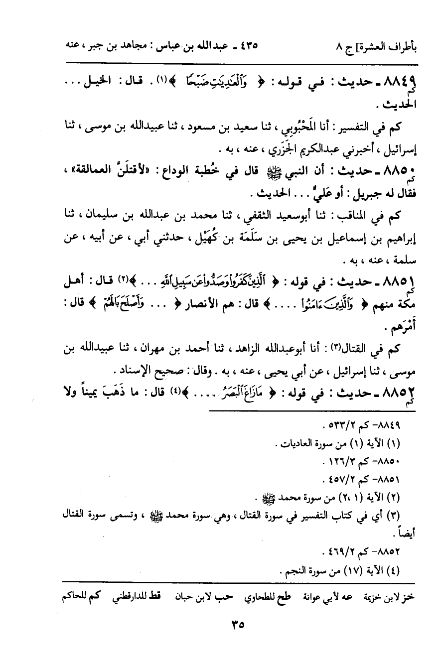 8849 - حَدِيثُ كم: " فِي قَوْلِهِ: وَالْعَادِيَاتِ ضَبْحًا. قَالَ: الْخَيْلِ. . . " الْحَدِيثَ.