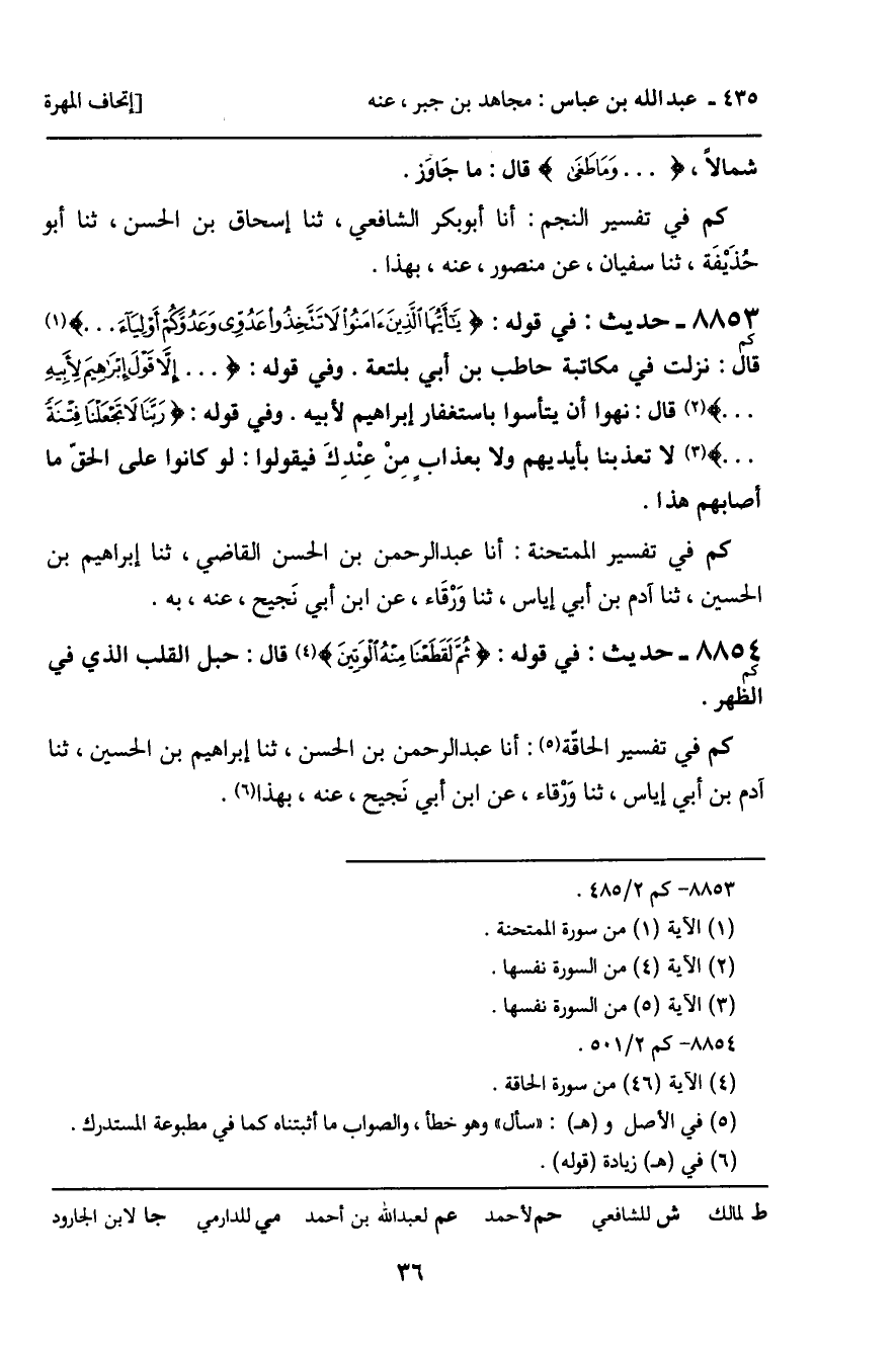 8853 - حَدِيثُ كم: " فِي قَوْلِهِ: يَأَيُّهَا الَّذِينَ آمَنُوا لا تَتَّخِذُوا عَدُوِّي وَعَدُوَّكُمْ أَوْلِيَاءَ ... قَالَ: نَزَلَتْ فِي مُكَاتَبَةِ حَاطِبِ بْنِ أَبِي بَلْتَعَةَ. وَفِي قَوْلِهِ: إِلا قَوْلَ إِبْرَاهِيمَ لأَبِيهِ ... قَالَ: نُهُوا أَنْ يَتَأَسَّوْا بِاسْتِغْفَارِ إِبْرَاهِيمَ لأَبِيهِ. وَفِي قَوْلِهِ: رَبَّنَا لا تَجْعَلْنَا فِتْنَةً ... لا تُعَذِّبْنَا بِأَيْدِيهِمْ وَلا بِعَذَابٍ مِنْ عِنْدِكَ، فَيَقُولُوا: لَوْ كَانُوا عَلَى الْحَقِّ مَا أَصَابَهُمْ هَذَا " الْحَدِيثَ.