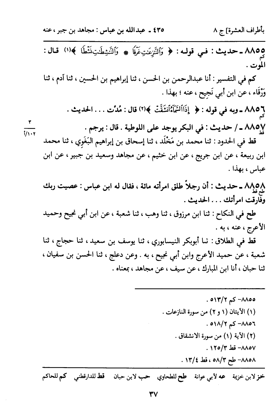 8855 - حَدِيثُ كم: " فِي قَوْلِهِ: وَالنَّازِعَاتِ غَرْقًا وَالنَّاشِطَاتِ نَشْطًا قَالَ: الْمَوْتَ " الْحَدِيثَ.