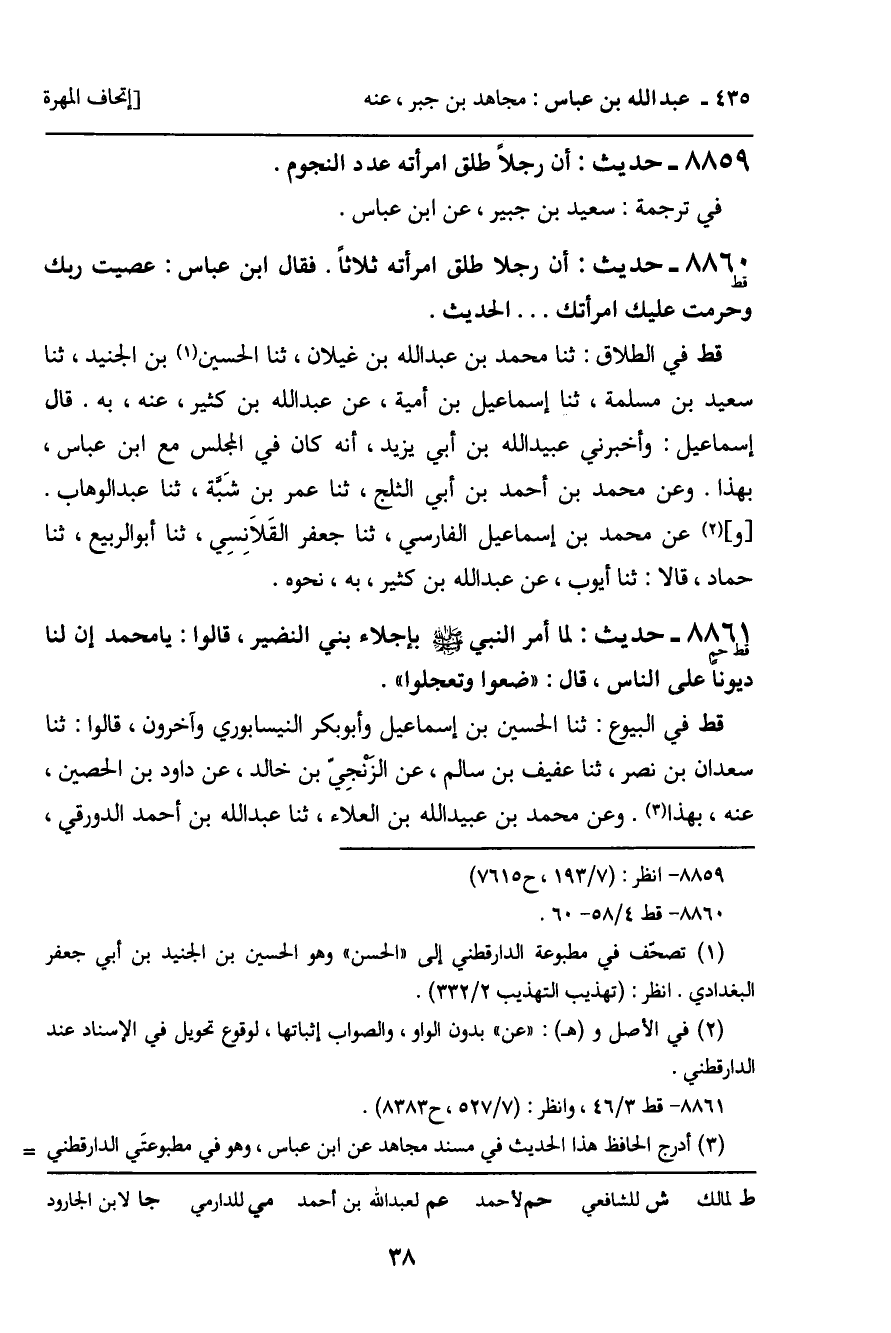 قط فِي الطَّلاقِ: ثنا مُحَمَّدُ بْنُ عَبْدِ اللَّهِ بْنِ غَيْلانَ، ثنا الْحُسَيْنُ بْنُ الْجُنَيْدِ، ثنا سَعِيدُ بْنُ مَسْلَمَةَ، ثنا إِسْمَاعِيلُ بْنُ أُمَيَّةَ، عَنْ عَبْدِ اللَّهِ بْنِ كَثِيرٍ، عَنْهُ، بِهِ. قَالَ إِسْمَاعِيلُ: وَأَخْبَرَنِي عُبَيْدُ اللَّهِ بْنُ أَبِي يَزِيدَ، أَنَّهُ كَانَ فِي الْمَجْلِسِ مَعَ ابْنِ عَبَّاسٍ، بِهَذَا. وَعَنْ مُحَمَّدِ بْنِ أَحْمَدَ بْنِ أَبِي الثَّلْجِ، ثنا عُمَرُ بْنُ شَبَّةَ، ثنا عَبْدُ الْوَهَّابِ. وَعَنْ مُحَمَّدِ بْنِ إِسْمَاعِيلَ الْفَارِسِيِّ، ثنا جَعْفَرٌ الْقَلانِسِيُّ، ثنا أَبُو الرَّبِيعِ، ثنا حَمَّادٌ، قَالا: ثنا أَيُّوبُ، عَنْ عَبْدِ اللَّهِ بْنِ كَثِيرٍ، بِهِ، نَحْوَهُ.