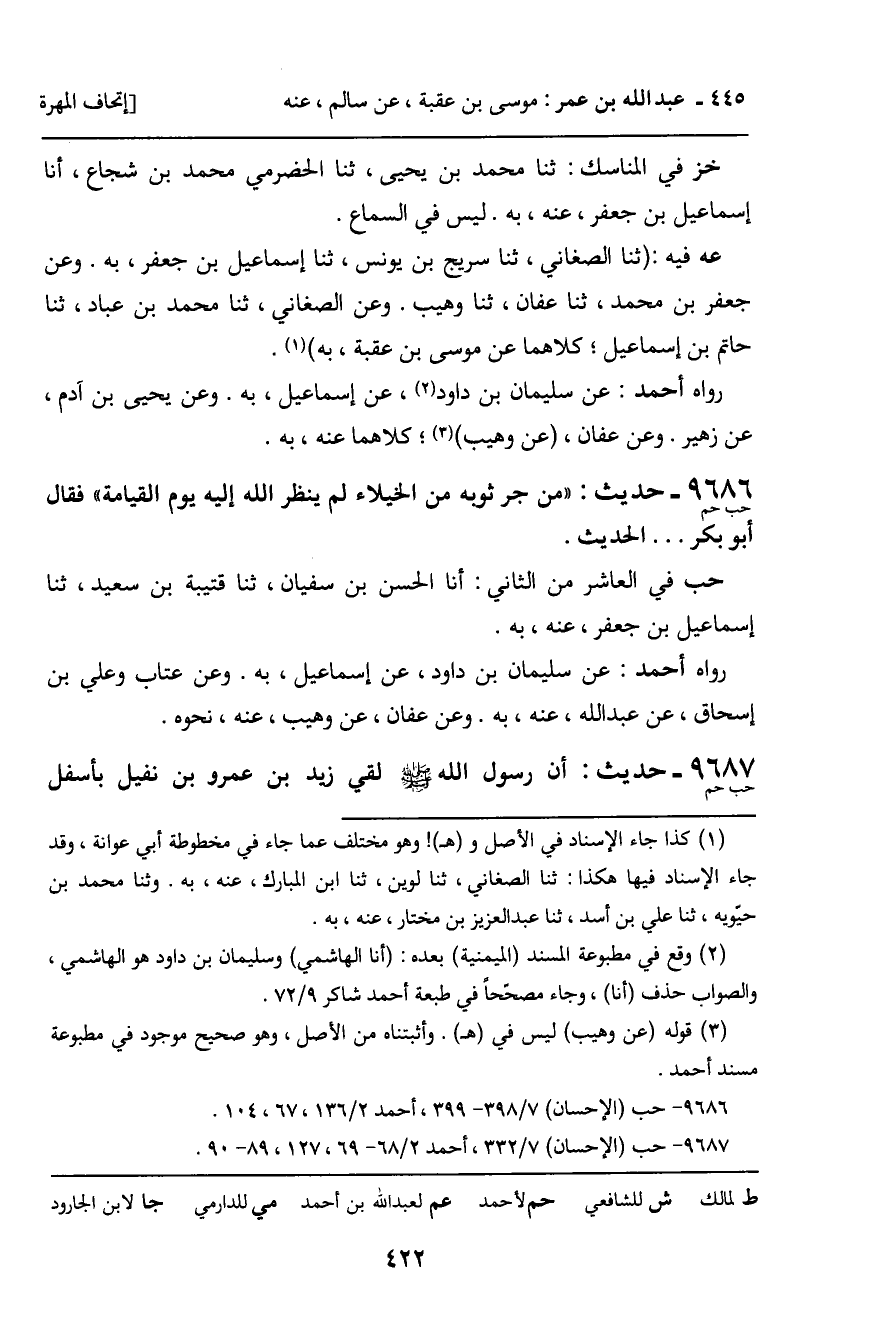 9687 - حَدِيثُ حب حم: " أَنَّ رَسُولَ اللَّهِ صَلَّى اللَّهُ عَلَيْهِ وَسَلَّمَ لَقِيَ زَيْدَ بْنَ عَمْرِو بْنِ نُفَيْلٍ بِأَسْفَلِ