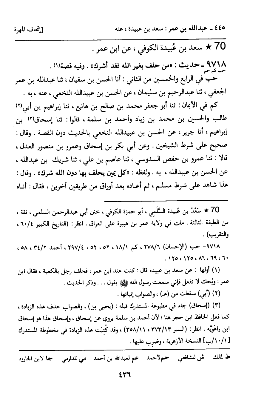 كم فِي الأَيْمَانِ: ثنا أَبُو جَعْفَرٍ مُحَمَّدُ بْنُ صَالِحِ بْنِ هَانِئٍ، ثنا إِبْرَاهِيمُ بْنُ أَبِي طَالِبٍ وَالْحُسَيْنُ بْنُ مُحَمَّدِ بْنِ زِيَادٍ وَأَحْمَدُ بْنُ سَلَمَةَ، قَالُوا: ثنا إِسْحَاقُ بْنُ إِبْرَاهِيمَ، أنا جَرِيرٌ، عَنِ الْحَسَنِ بْنِ عُبَيْدِ اللَّهِ النَّخَعِيِّ بِالْحَدِيثِ دُونَ الْقِصَّةِ. وَقَالَ: صَحِيحٌ عَلَى شَرْطِ الشَّيْخَيْنِ. وَعَنْ أَبِي بَكْرِ بْنِ إِسْحَاقَ وَعَمْرِو بْنِ مَنْصُورٍ الْعَدْلِ، قَالا: ثنا عَمْرُو بْنُ حَفْصٍ السَّدُوسِيُّ، ثنا عَاصِمُ بْنُ عَلِيٍّ، ثنا شَرِيكُ بْنُ عَبْدِ اللَّهِ، عَنِ الْحَسَنِ بْنِ عُبَيْدِ اللَّهِ، بِهِ. وَلَفْظُهُ: " كُلُّ يَمِينٍ يُحْلَفُ بِهَا دُونَ اللَّهِ شِرْكٌ ". وَقَالَ: هَذَا شَاهِدٌ عَلَى شَرْطِ مُسْلِمٍ، ثُمَّ أَعَادَهُ بَعْدَ أَوْرَاقٍ مِنْ طَرِيقَيْنِ آخَرَيْنِ، فَقَالَ: أناهُ