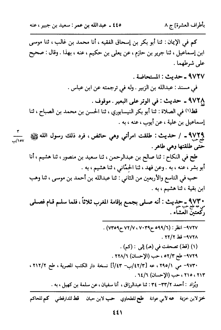 9729 - حَدِيثُ حب: " طَلَّقْتُ امْرَأَتِي وَهِيَ حَائِضٌ، فَرَدَّ ذَلِكَ رَسُولُ اللَّهِ صَلَّى اللَّهُ عَلَيْهِ وَسَلَّمَ حَتَّى طَلَّقْتُهَا وَهِيَ طَاهِرٌ " الْحَدِيثَ.