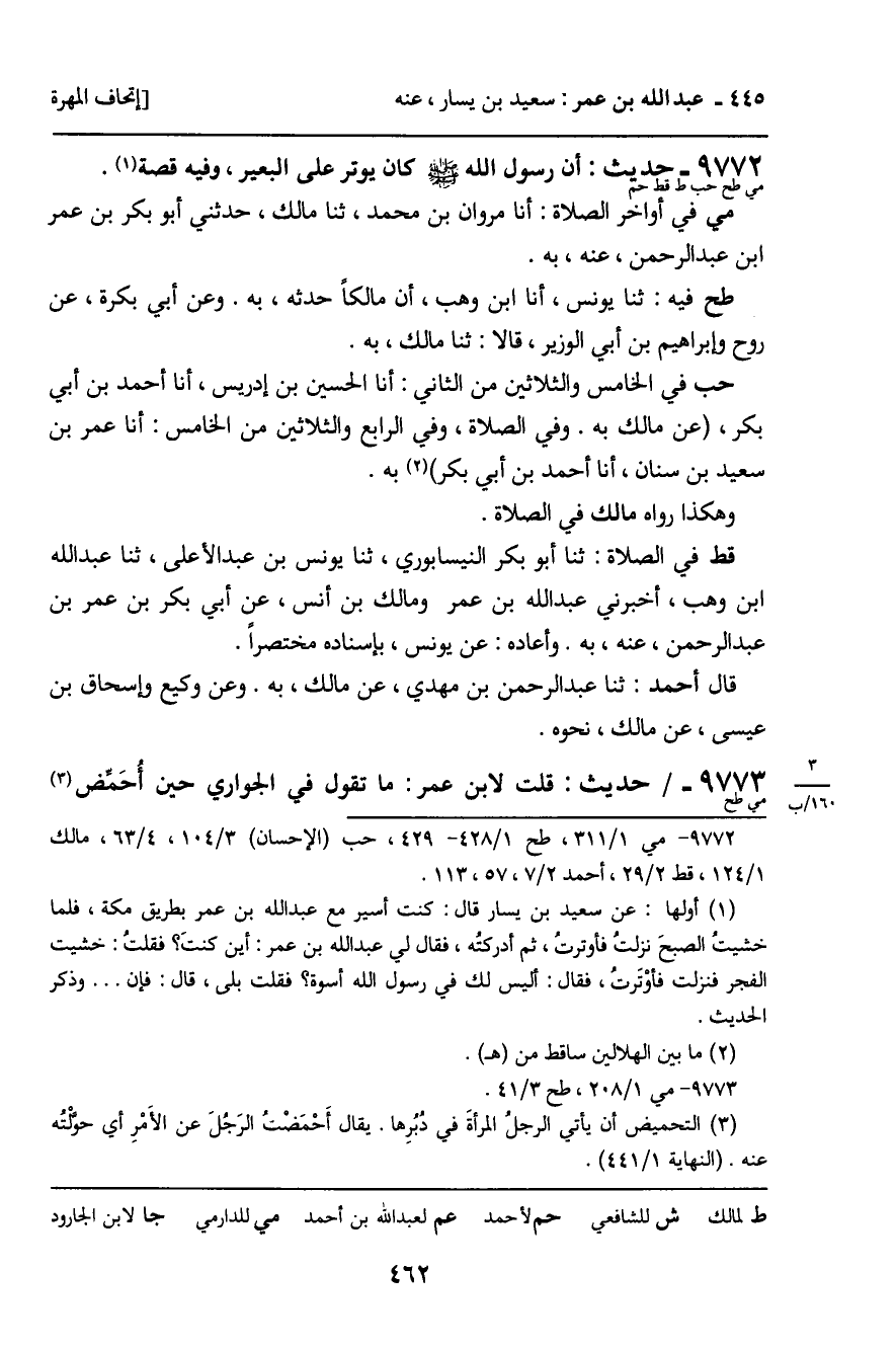 9772 - حَدِيثُ مي حب ط قط حم: " أَنَّ رَسُولَ اللَّهِ صَلَّى اللَّهُ عَلَيْهِ وَسَلَّمَ كَانَ يُوتِرُ عَلَى الْبَعِيرِ ... " الْحَدِيثَ. وَفِيهِ قِصَّةٌ.