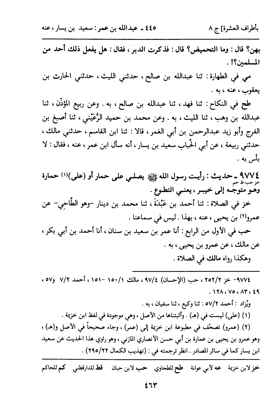 9774 - حَدِيثُ خز حب ط حم: " رَأَيْتُ رَسُولَ اللَّهِ صَلَّى اللَّهُ عَلَيْهِ وَسَلَّمَ يُصَلِّي عَلَى حِمَارٍ أَوْ عَلَى حِمَارَةٍ، وَهُوَ مُتَوَجِّهٌ إِلَى خَيْبَرَ، يَعْنِي: التَّطَوُّعَ " الْحَدِيثَ.