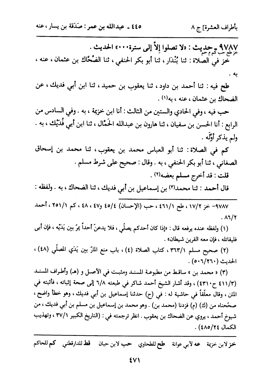 9787 - حَدِيثُ خز حب كم م حم: " لا تُصَلُّوا إِلا إِلَى سُتْرَةٍ. . . " الْحَدِيثَ.
