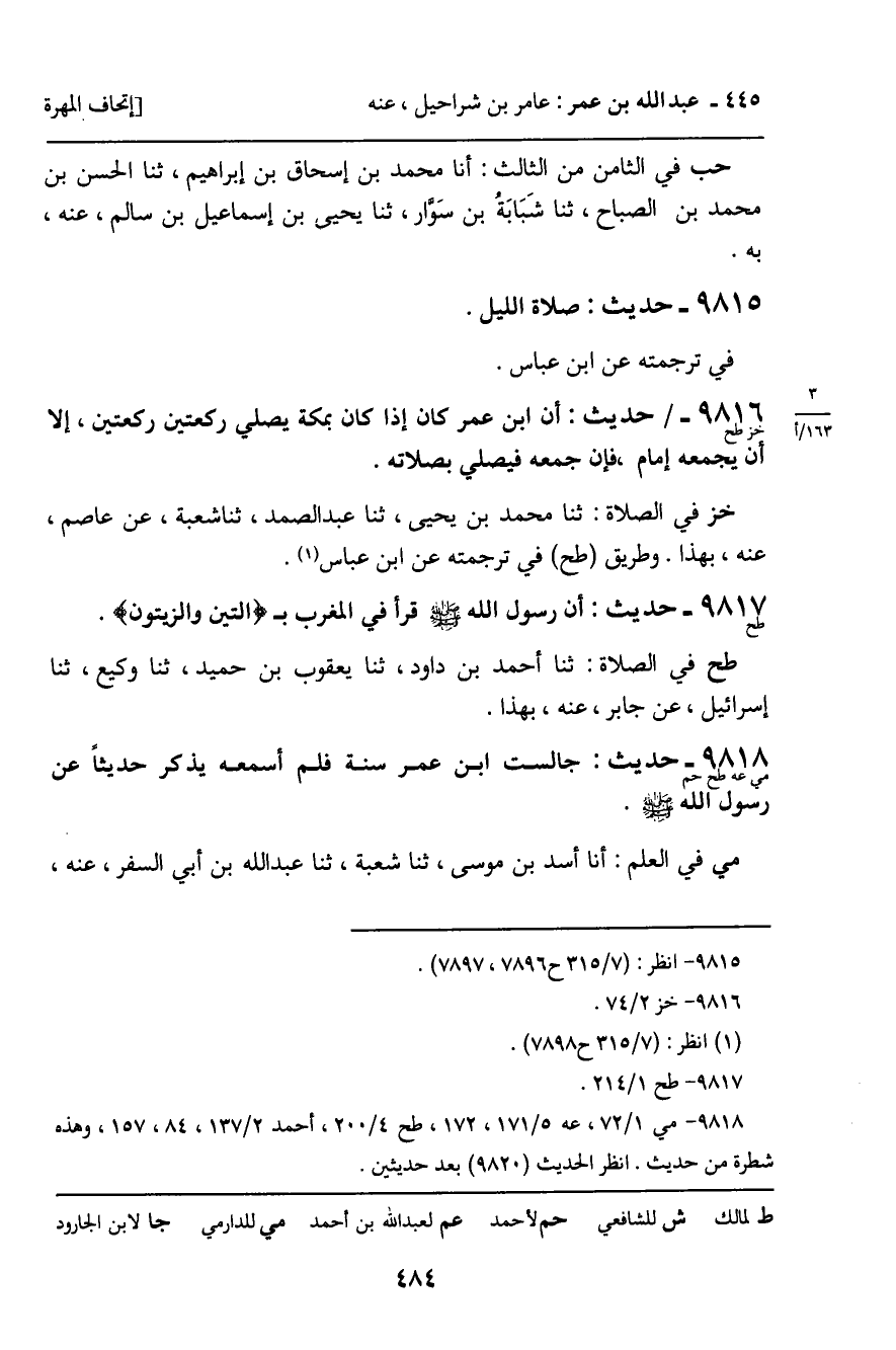9816 - حَدِيثُ خز: " إِنَّ ابْنَ عُمَرَ كَانَ إِذَا كَانَ بِمَكَّةَ يُصَلِّي رَكْعَتَيْنِ رَكْعَتْيَنِ، إِلا أَنْ يَجْمَعَهُ إِمَامٌ، فَإِنْ جَمَعَهُ فَيُصَلِّي بِصَلاتِهِ " الْحَدِيثَ.