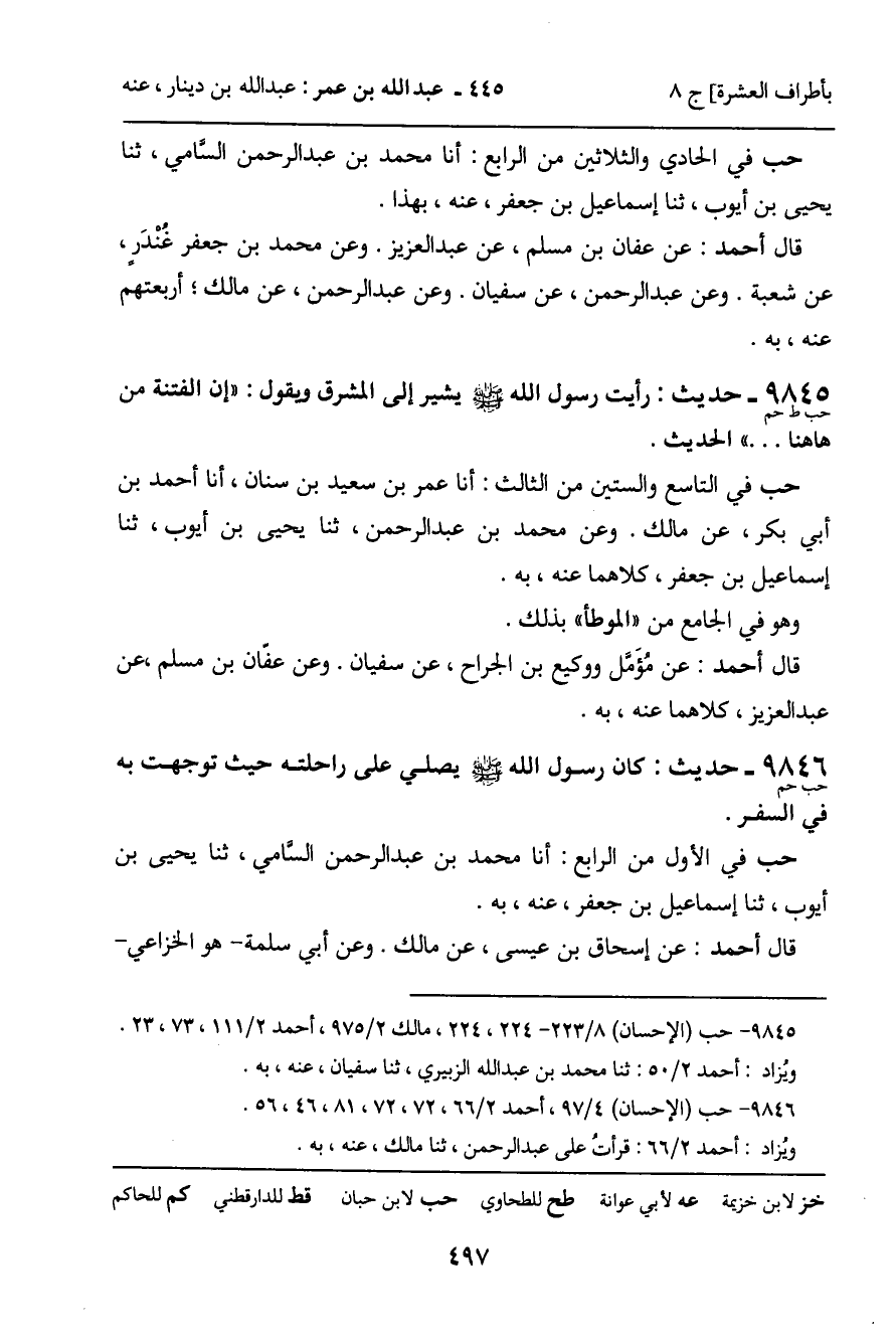 9845 - حَدِيثُ حب ط حم: " رَأَيْتُ رَسُولَ اللَّهِ صَلَّى اللَّهُ عَلَيْهِ وَسَلَّمَ يُشِيرُ إِلَى الْمَشْرِقِ، وَيَقُولُ: " إِنَّ الْفِتْنَةَ مِنْ هَهُنَا. . . " الْحَدِيثَ.