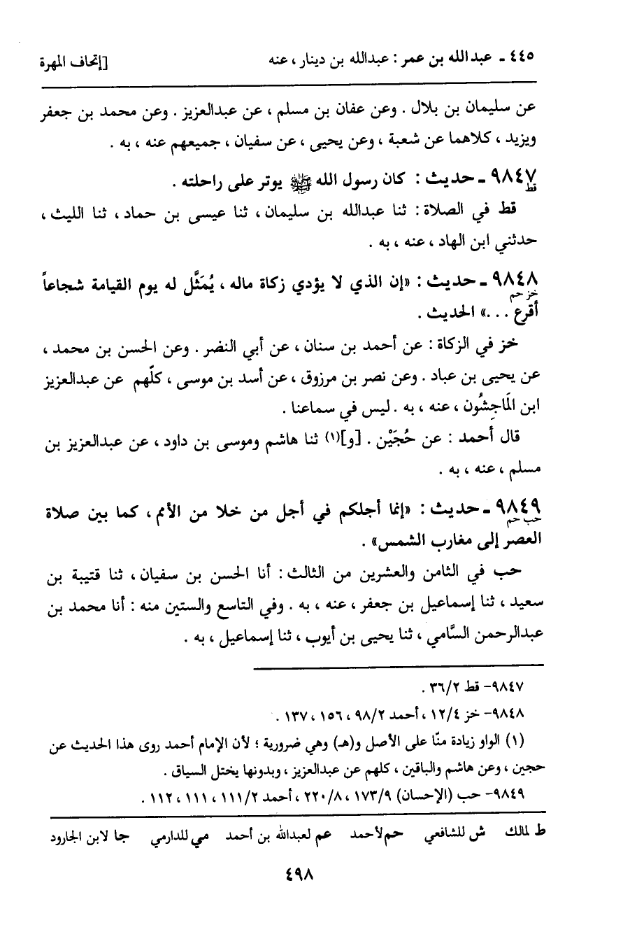 خز فِي الزَّكَاةِ: عَنْ أَحْمَدَ بْنِ سِنَانٍ، عَنْ أَبِي النَّضْرِ. وَعَنِ الْحَسَنِ بْنِ مُحَمَّدٍ، عَنْ يَحْيَى بْنِ عَبَّادٍ. وَعَنْ نَصْرِ بْنِ مَرْزُوقٍ، عَنْ أَسَدِ بْنِ مُوسَى، كُلُّهُمْ عَنْ عَبْدِ الْعَزِيزِ بْنِ الْمَاجِشُونَ، عَنْهُ، بِهِ. لَيْسَ فِي سَمَاعِنَا.
