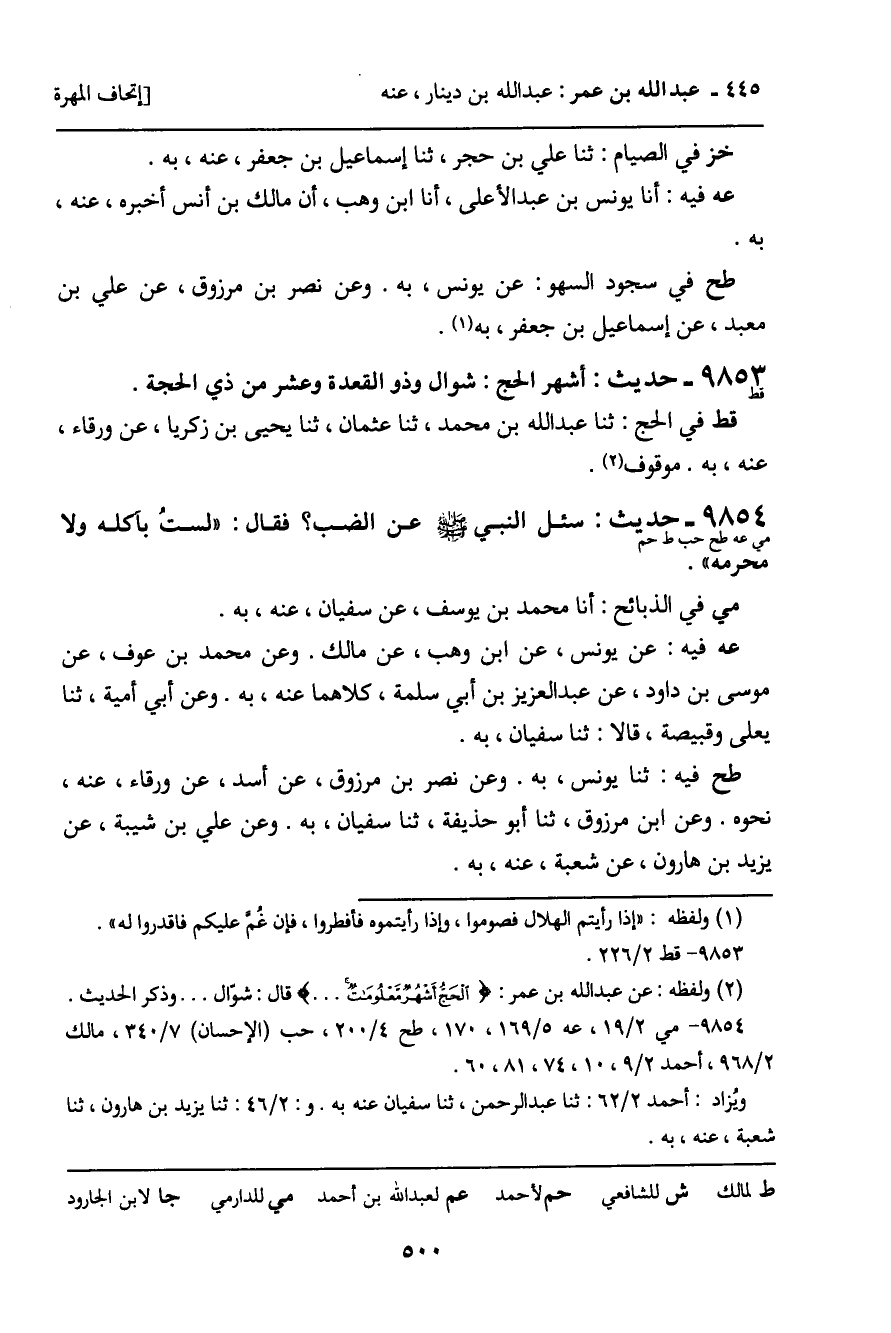 9854 - حَدِيثُ مي حب ط حم: " سُئِلَ النَّبِيُّ صَلَّى اللَّهُ عَلَيْهِ وَسَلَّمَ عَنِ الضَّبِّ؟ فَقَالَ: " لَسْتُ بِآكِلِهِ وَلا مُحَرِّمِهِ " الْحَدِيثَ.