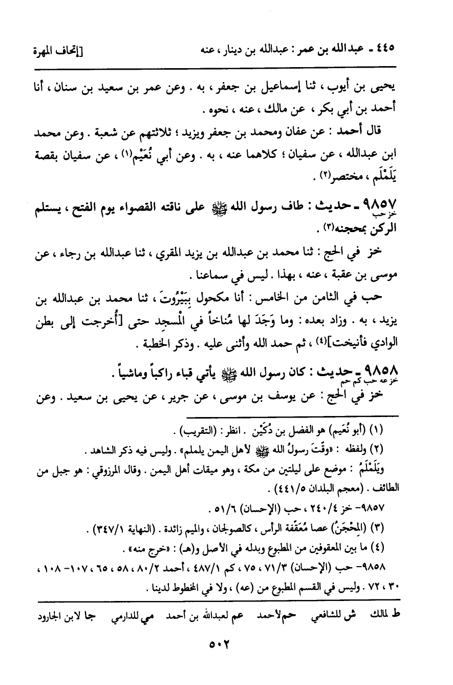 9857 - حَدِيثُ خز حب: " طَافَ رَسُولُ اللَّهِ صَلَّى اللَّهُ عَلَيْهِ وَسَلَّمَ عَلَى نَاقَتِهِ الْقَصْوَاءِ يَوْمَ الْفَتْحِ، يَسْتَلِمُ الرُّكْنَ بِمِحْجَنِهِ " الْحَدِيثَ.