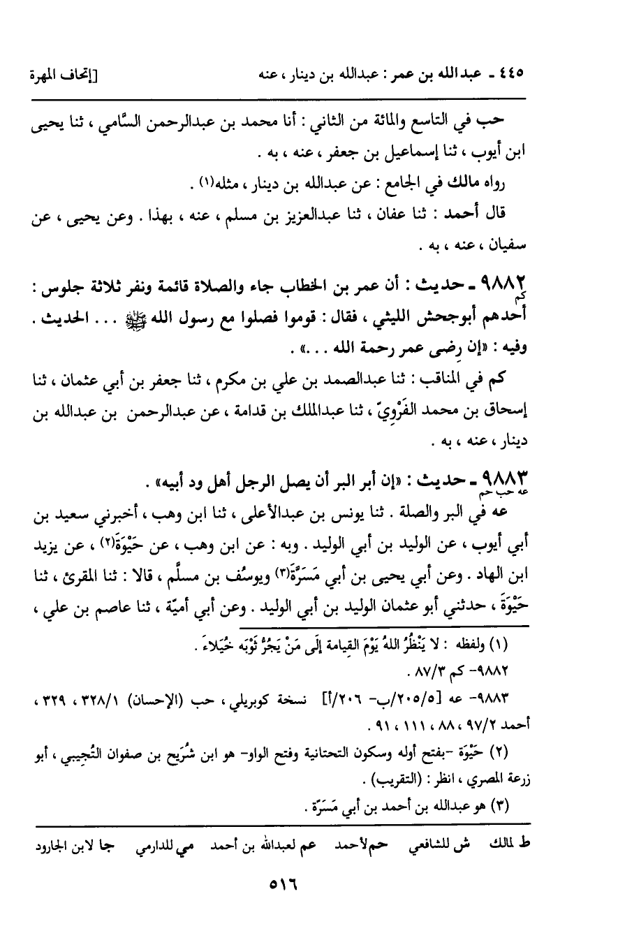 فِي (الْبِرِّ وَالصِّلَةِ) : ثنا يُونُسُ بْنُ عَبْدِ الأَعْلَى، ثنا ابْنُ وَهْبٍ، أَخْبَرَنِي سَعِيدُ بْنُ أَبِي أَيُّوبَ، عَنِ الْوَلِيدِ بْنِ أَبِي الْوَلِيدِ. وَبِهِ: عَنِ ابْنِ وَهْبٍ، عَنْ حَيْوَةَ، عَنْ يَزِيدَ بْنِ الْهَادِ. وَعَنْ أَبِي يَحْيَى بْنِ أَبِي مَسَرَّةَ، وَيُوسُفَ بْنِ مُسَلَّمٍ، قَالا: ثنا الْمُقْرِئُ، ثنا حَيْوَةُ، حَدَّثَنِي أَبُو عُثْمَانَ الْوَلِيدُ بْنُ أَبِي الْوَلِيدِ. وَعَنْ أَبِي أُمَيَّةَ، ثنا عَاصِمُ بْنُ عَلِيٍّ،