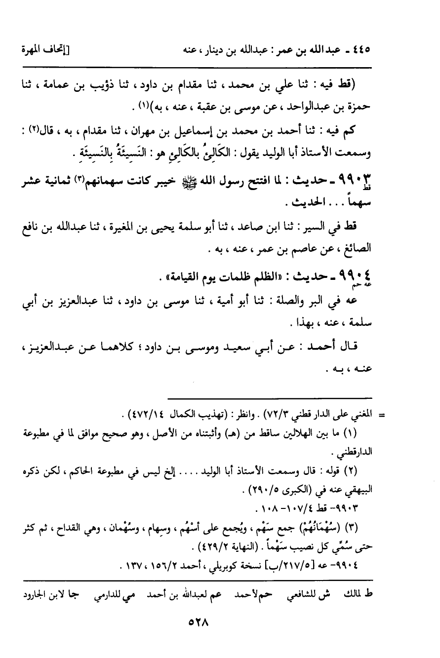 9903 - حَدِيثُ قط: " لَمَّا افْتَتَحَ رَسُولُ اللَّهِ صَلَّى اللَّهُ عَلَيْهِ وَسَلَّمَ خَيْبَرَ كَانَتْ سُهْمَانُهُمْ ثَمَانِيَةَ عَشَرَ سَهْمًا. . . " الْحَدِيثَ.