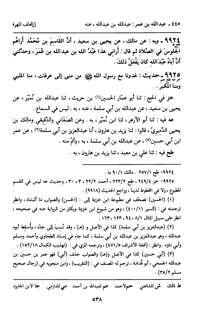 خز فِي الْحَجِّ: ثنا أَبُو عَمَّارٍ الْحُسَيْنُ بْنُ حُرَيْثٍ، ثنا عَبْدُ اللَّهِ بْنُ نُمَيْرٍ، عَنْ يَحْيَى بْنِ سَعِيدٍ، عَنْ عَبْدِ اللَّهِ بْنِ أَبِي سَلَمَةَ، عَنْهُ، بِهِ. لَيْسَ فِي السَّمَاعِ.