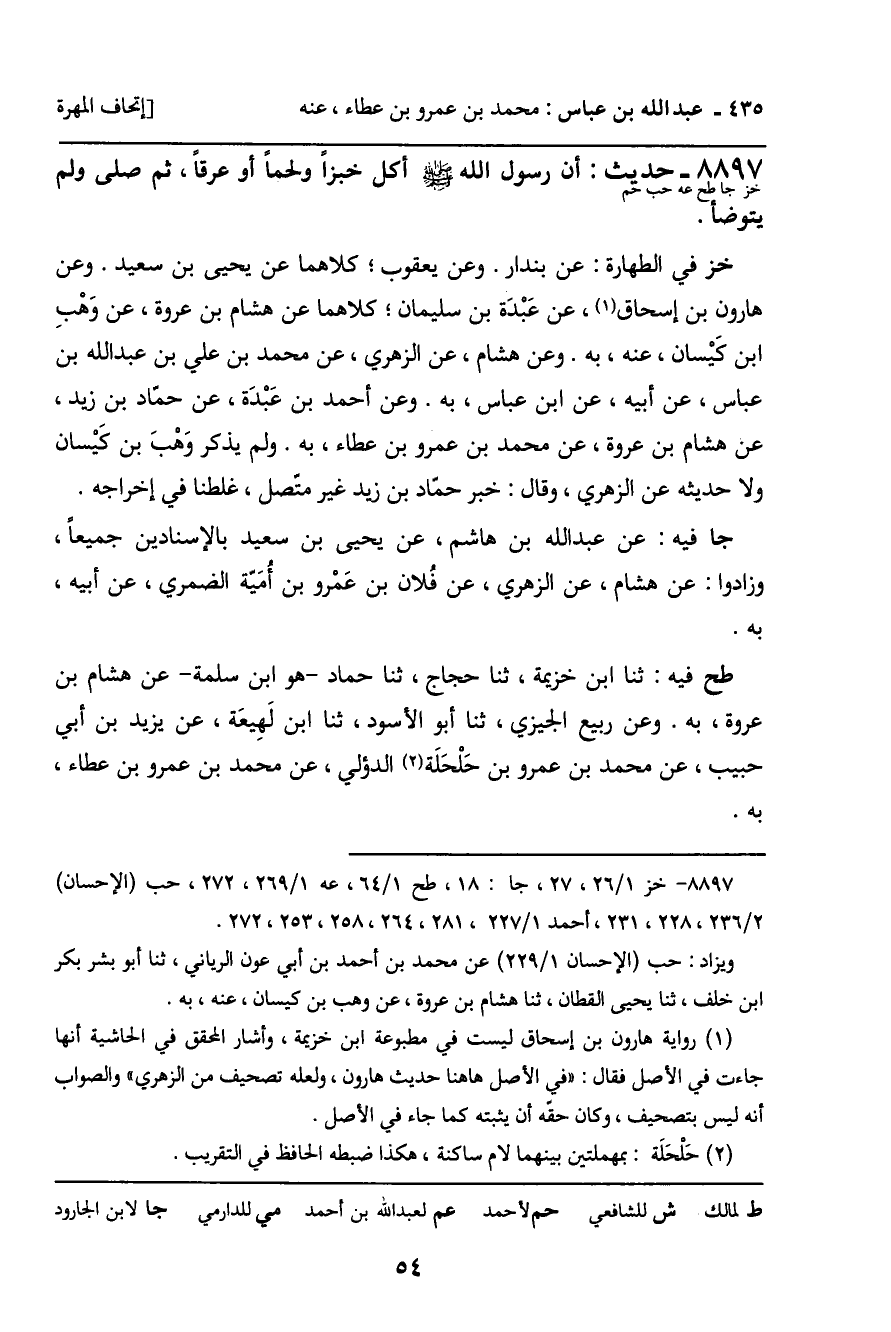 خز فِي الطَّهَارَةِ: عَنْ بُنْدَارٍ. وَعَنْ يَعْقُوبَ؛ كِلاهُمَا عَنْ يَحْيَى بْنِ سَعِيدٍ. وَعَنْ هَارُونَ بْنِ إِسْحَاقَ، عَنْ عَبْدَةَ بْنِ سُلَيْمَانَ؛ كِلاهُمَا عَنْ هِشَامِ بْنِ عُرْوَةَ، عَنْ وَهْبِ بْنِ كَيْسَانَ، عَنْهُ، بِهِ. وَعَنْ هِشَامٍ، عَنِ الزُّهْرِيِّ، عَنْ مُحَمَّدِ بْنِ عَلِيِّ بْنِ عَبْدِ اللَّهِ بْنِ عَبَّاسٍ، عَنْ أَبِيهِ، عَنِ ابْنِ عَبَّاسٍ، بِهِ. وَعَنْ أَحْمَدَ بْنِ عَبْدَةَ، عَنْ حَمَّادِ بْنِ زَيْدٍ، عَنْ هِشَامِ بْنِ عُرْوَةَ، عَنْ مُحَمَّدِ بْنِ عَمْرِو بْنِ عَطَاءٍ، بِهِ. وَلَمْ يَذْكُرْ وَهْبَ بْنَ كَيْسَانَ، وَلا حَدِيثَهُ عَنِ الزُّهْرِيِّ، وَقَالَ: خَبَرُ حَمَّادِ بْنِ زَيْدٍ غَيْرُ مُتَّصِلٍ، غَلِطْنَا فِي إِخْرَاجِهِ.