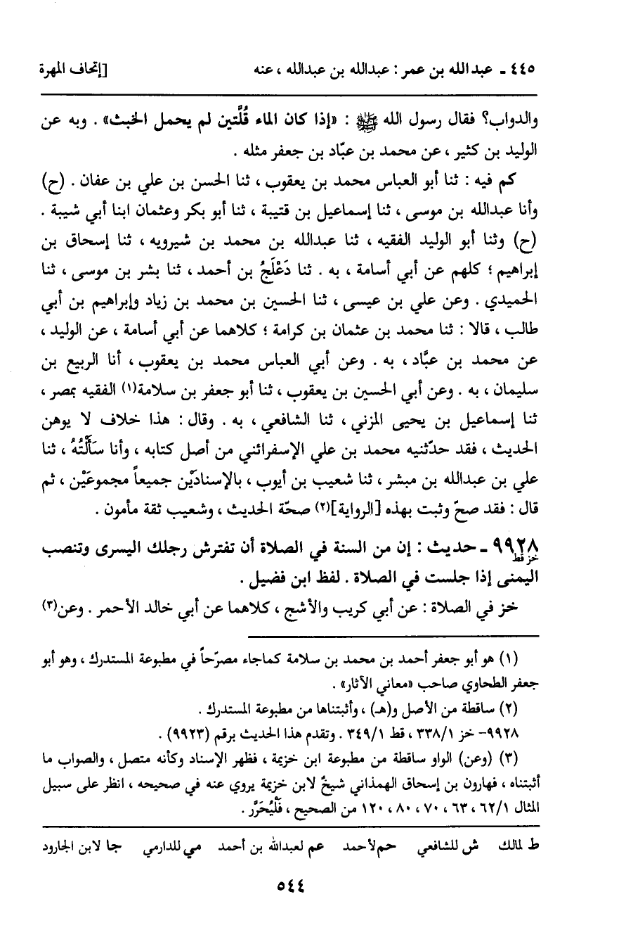 -[545]- هَارُونَ بْنِ إِسْحَاقَ، عَنِ ابْنِ فُضَيْلٍ. وَعَنْ سَلْمِ بْنِ جُنَادَةَ، عَنْ وَكِيعٍ، عَنْ سُفْيَانَ؛ كُلُّهُمْ عَنْ يَحْيَى بْنِ سَعِيدٍ، سَمِعْتُ الْقَاسِمَ بْنَ مُحَمَّدٍ يَقُولُ: ثنا عَبْدُ اللَّهِ بْنُ عَبْدِ اللَّهِ بْنِ عُمَرَ، بِهَذَا. وَعَنْ سَعِيدِ بْنِ عَبْدِ الرَّحْمَنِ الْمَخْزُومِيِّ، عَنْ سُفْيَانَ، عَنْ يَحْيَى بْنِ سَعِيدٍ بِهِ، وَزَادَ فِيهِ: وَكَانَ النَّبِيُّ صَلَّى اللَّهُ عَلَيْهِ وَسَلَّمَ إِذَا جَلَسَ فِي الصَّلاةِ أَضْجَعَ الْيُسْرَى وَنَصَبَ الْيُمْنَى، قَالَ ابْنُ خُزَيْمَةَ: هَذِهِ الزِّيَادَةُ لا أَحْسَبُهَا مَحْفُوظَهً.