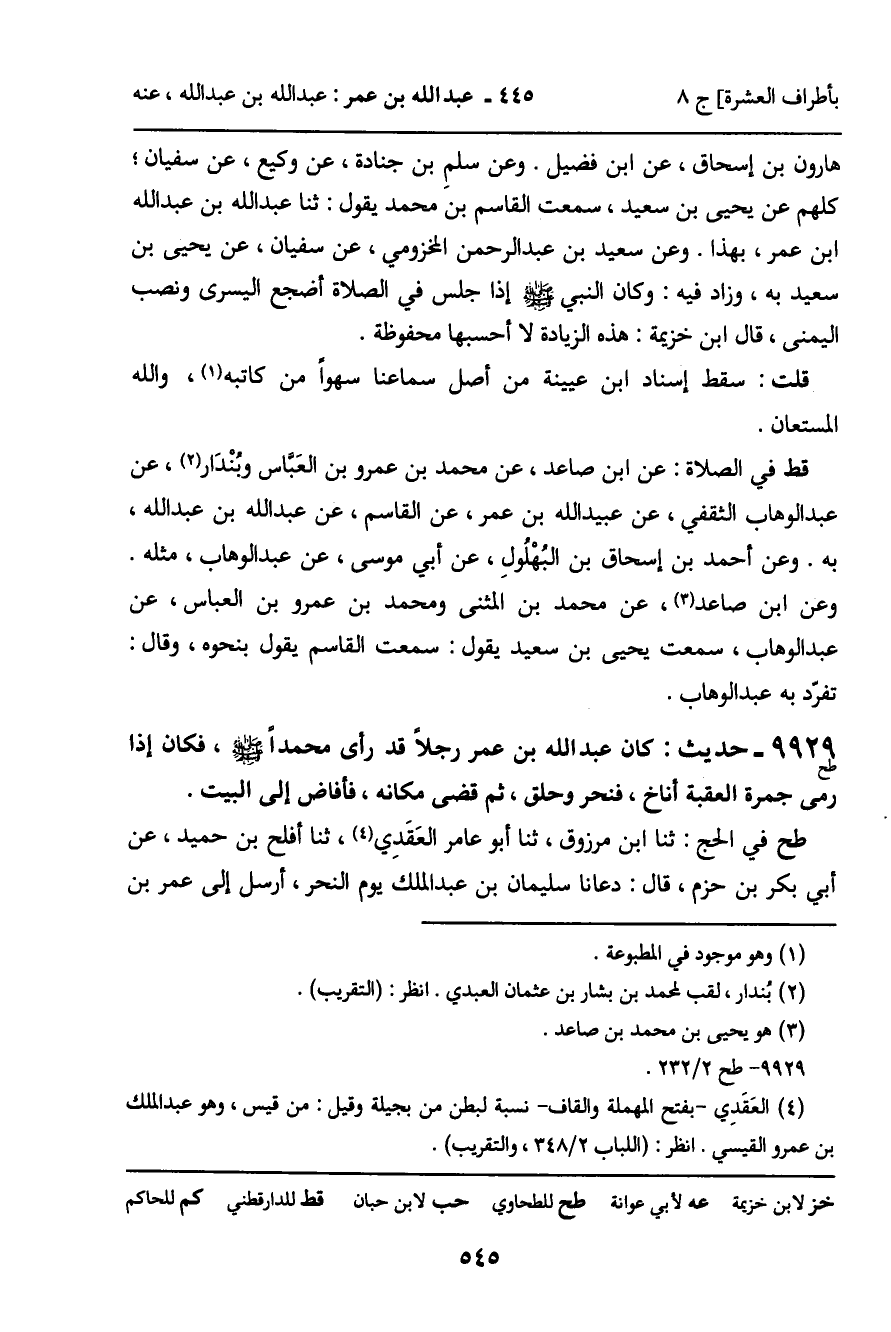 9929 - حَدِيثُ: " كَانَ عَبْدُ اللَّهِ بْنُ عُمَرَ رَجُلا قَدْ رَأَى مُحَمَّدًا صَلَّى اللَّهُ عَلَيْهِ وَسَلَّمَ، فَكَانَ إِذَا رَمَى جَمْرَةَ الْعَقَبَةِ أَنَاخَ، فَنَحَرَ وَحَلَقَ، ثُمَّ قَضَى مَكَانَهُ، فَأَفَاضَ إِلَى الْبَيْتِ " الْحَدِيثَ.
