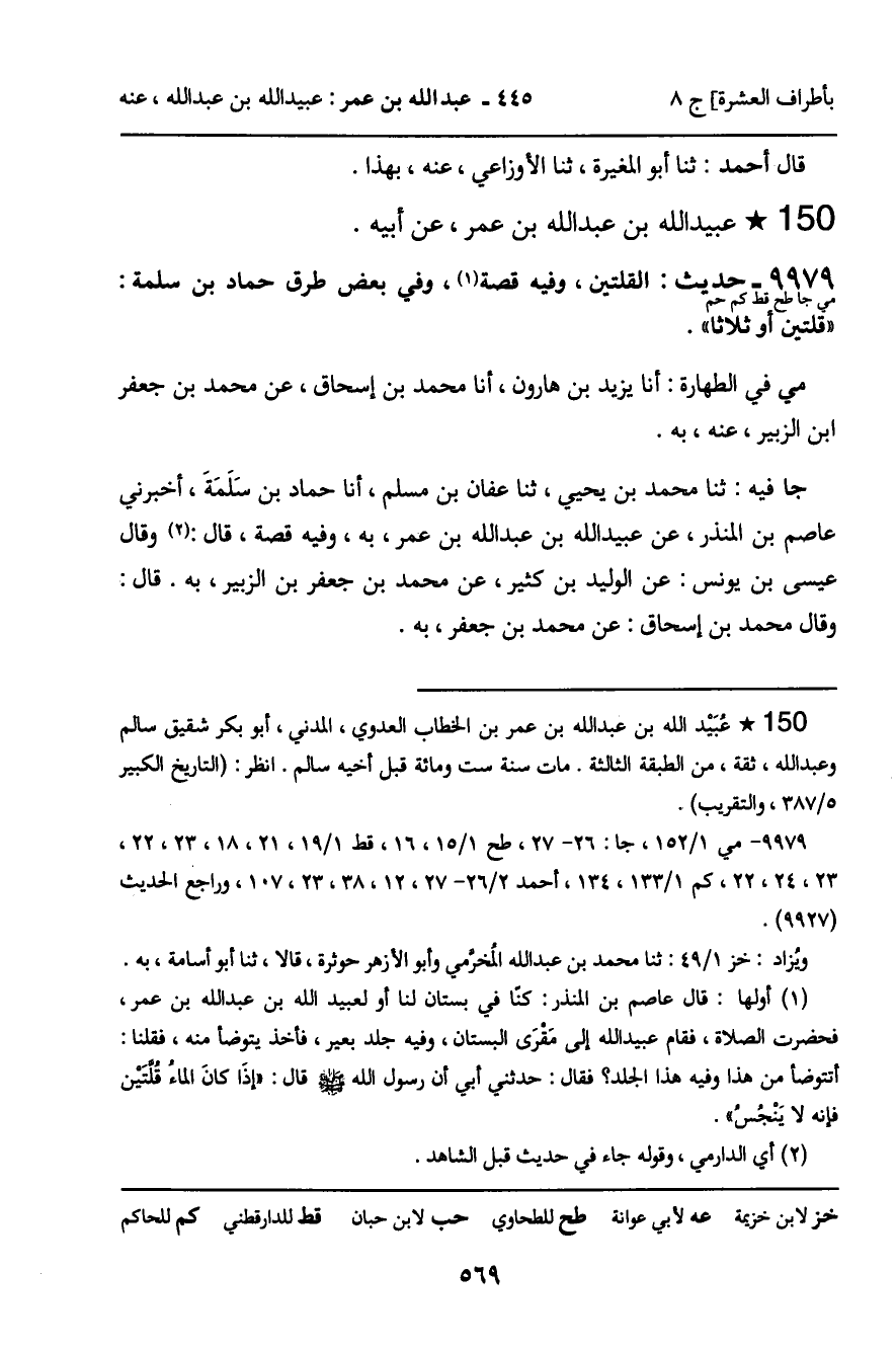 قط فِي الطَّهَارَةِ: ثنا مُحَمَّدُ بْنُ نُوحٍ، ثنا هَارُونُ بْنُ إِسْحَاقَ، ثنا الْمُحَارِبِيُّ. ح وَثنا عَبْدُ اللَّهِ بْنُ جَعْفَرِ بْنِ خُشَيْشٍ، ثنا يُوسُفُ بْنُ مُوسَى، ثنا جَرِيرٌ. ح وَثنا أَحْمَدُ بْنُ عَبْدِ اللَّهِ الْوَكِيلُ، ثنا الْحَسَنُ بْنُ عَرَفَةَ، ثنا عَبْدَةُ بْنُ سُلَيْمَانَ؛ كُلُّهُمْ عَنْ مُحَمَّدِ بْنِ إِسْحَاقَ، عَنْ مُحَمَّدِ بْنِ جَعْفَرِ بْنِ الزُّبَيْرِ، عَنْهُ، بِهِ. وَعَنْ عُثْمَانَ بْنِ أَحْمَدَ الدَّقَّاقِ، عَنْ عَلِيِّ بْنِ إِبْرَاهِيمَ الْوَاسِطِيِّ، عَنْ مُحَمَّدِ بْنِ أَبِي نُعَيْمٍ، عَنْ سَعِيدِ بْنِ زَيْدٍ. وَعَنْ أَحْمَدَ بْنِ كَامِلٍ، عَنْ أَحْمَدَ بْنِ سَعِيدِ بْنِ شَاهِينَ، عَنْ مُحَمَّدِ بْنِ سَعْدٍ، عَنِ الْوَاقِدِيِّ، عَنْ سُفْيَانَ الثَّوْرِيِّ. وَعَنْ أَحْمَدَ بْنِ سَعْدَانَ، عَنْ شُعَيْبِ بْنِ أَيُّوبَ، عَنْ حُسَيْنِ بْنِ عَلِيٍّ، عَنْ زَائِدَةَ؛ ثَلاثَتُهُمْ عَنْ مُحَمَّدِ بْنِ إِسْحَاقَ، بِهِ. وَعَنْ مُحَمَّدِ بْنِ عَلِيِّ بْنِ مُحَمَّدِ بْنِ سَهْلٍ الإِمَامِ، ثنا الْحُسَيْنُ بْنُ عَلِيِّ بْنِ عَبْدِ الصَّمَدِ، ثنا بَحْرُ بْنُ الْحَكَمِ، ثنا عَبَّادُ بْنُ صُهَيْبٍ، ثنا الْوَلِيدُ بْنُ كَثيِرٍ، عَنْ مُحَمَّدِ بْنِ جَعْفَرِ بْنِ الزُّبَيْرِ، عَنْ عُبَيْدِ اللَّهِ، بِهِ.وَعَنِ الْحُسَيْنِ بْنِ إِسْمَاعِيلَ، عَنِ الْحَسَنِ بْنِ مُحَمَّدِ بْنِ الصَّبَّاحِ، هُوَ الزَّعْفَرَانِيُّ. وَعَنْ أَبِي صَالِحٍ الأَصْبَهَانِيِّ، عَنْ أَبِي مَسْعُودٍ، كِلاهُمَا عَنْ يَزِيدَ بْنِ هَارُونَ، زَادَ الزَّعْفَرَانِيُّ: وَعَفَّانُ وَيَعْقُوبُ بْنُ إِسْحَاقَ. وَعَنْ دَعْلَجِ بْنِ أَحْمَدَ، عَنِ