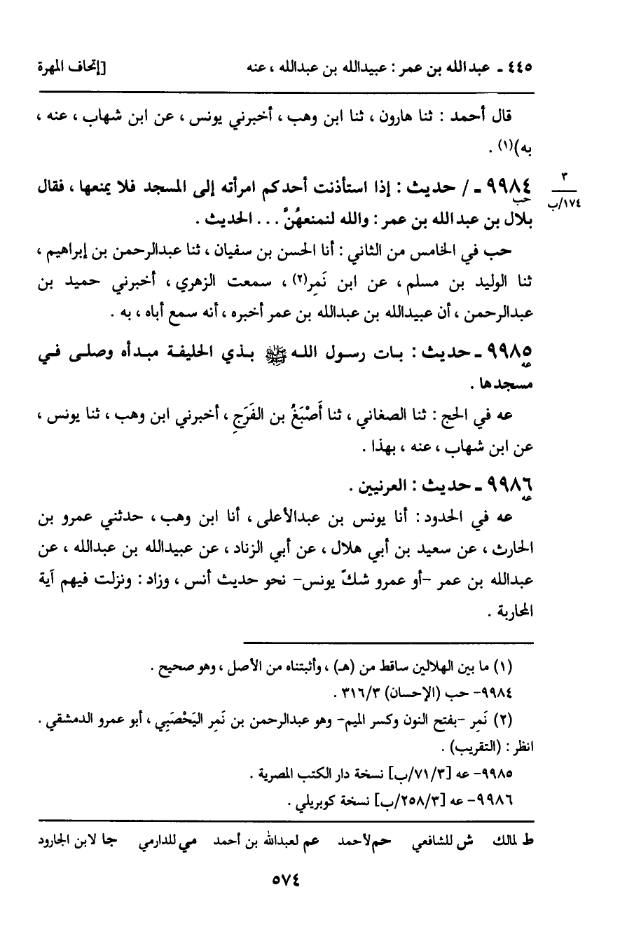 9984 - حَدِيثُ حب: " إِذَا اسْتَأْذَنَتْ أَحَدَكُمُ امْرَأَتُهُ إِلَى الْمَسْجِدِ فَلا يَمْنَعْهَا، فَقَالَ بِلالُ بْنُ عَبْدِ اللَّهِ بْنِ عُمَرَ: وَاللَّهِ لَنَمْنَعُهُنَّ. . . " الْحَدِيثَ.