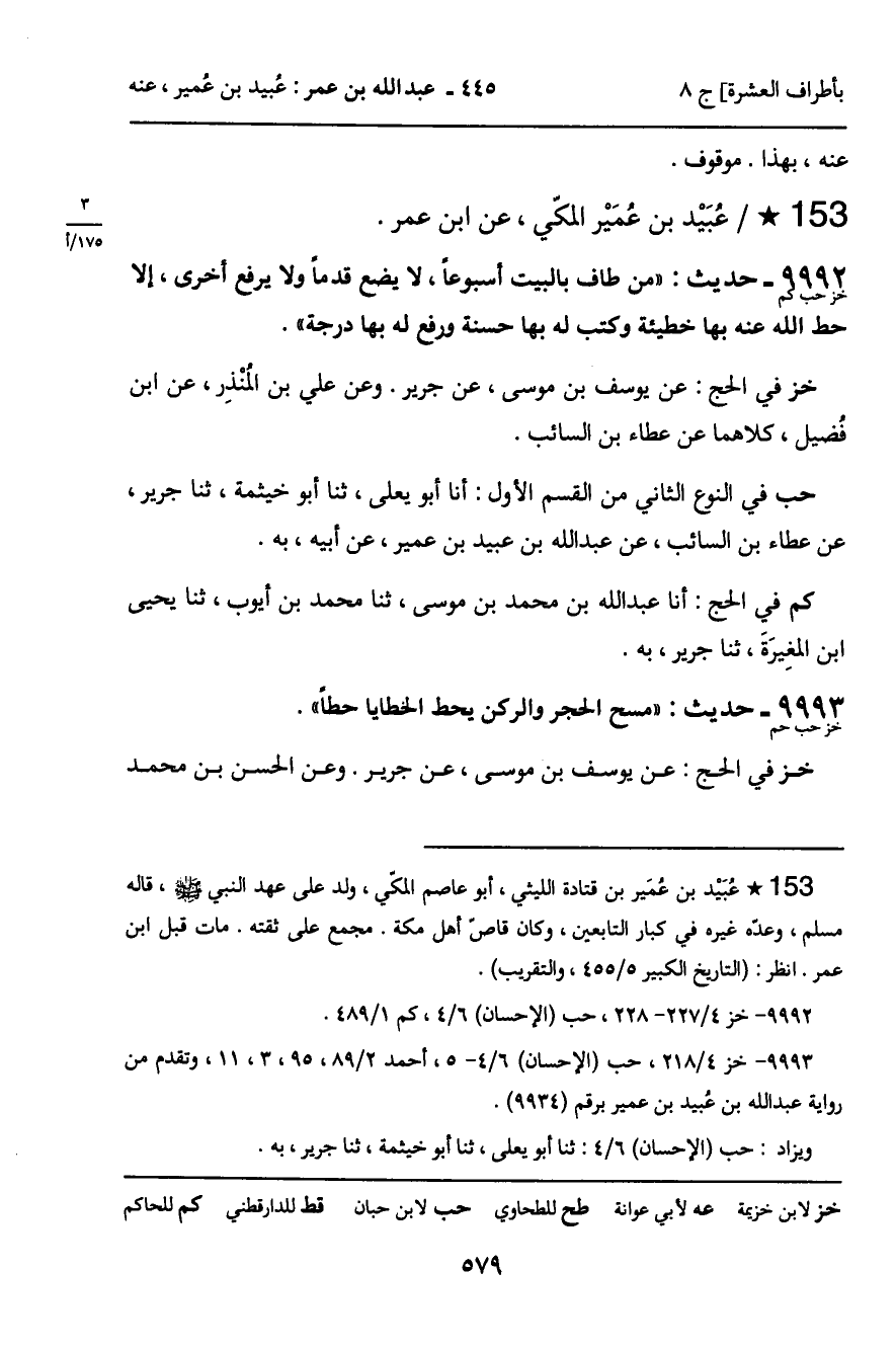 -[581]- وَزَادَ: " مَنْ طَافَ بِهَذَا الْبَيْتِ أُسْبُوعًا يُحْصِيهِ كُتِبَ لَهُ بِكُلِّ خُطْوَةٍ حَسَنَةٌ. . . " الْحَدِيثَ. رَوَاهُ هُشَيْمٌ، وَابْنُ عُيَيْنَةَ، عَنْ عَطَاءِ بْنِ السَّائِبِ، عَنْ عَبْدِ اللَّهِ بْنِ عُبَيْدِ بْنِ عُمَيْرٍ، أَنَّ أَبَاهُ قَالَ لابْنِ عُمَرَ، وَقَدْ مَضَى. .