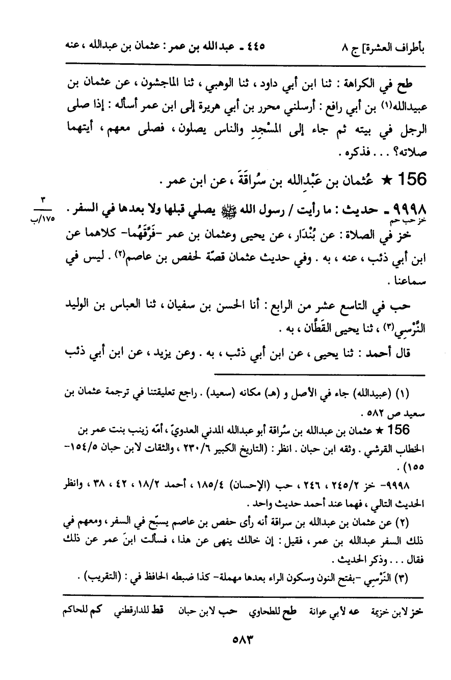 9998 - حَدِيثُ خز حب حم: " مَا رَأَيْتُ رَسُولَ اللَّهِ صَلَّى اللَّهُ عَلَيْهِ وَسَلَّمَ يُصَلِّي قَبْلَهَا وَلا بَعْدَهَا فِي السَّفَرِ " الْحَدِيثَ.