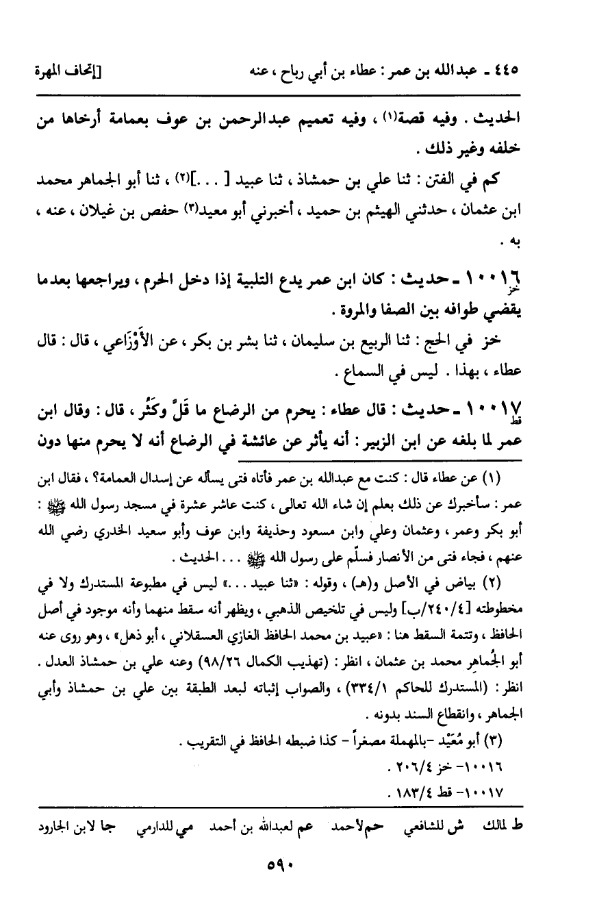 10016 - حَدِيثُ خز: " كَانَ ابْنُ عُمَرَ يَدَعُ التَّلْبِيَةَ إِذَا دَخَلَ الْحَرَمَ، وَيُرَاجِعُهَا بَعْدَمَا يَقْضِي طَوَافَهُ بَيْنَ الصَّفَا وَالْمَرْوَةِ " الْحَدِيثَ.