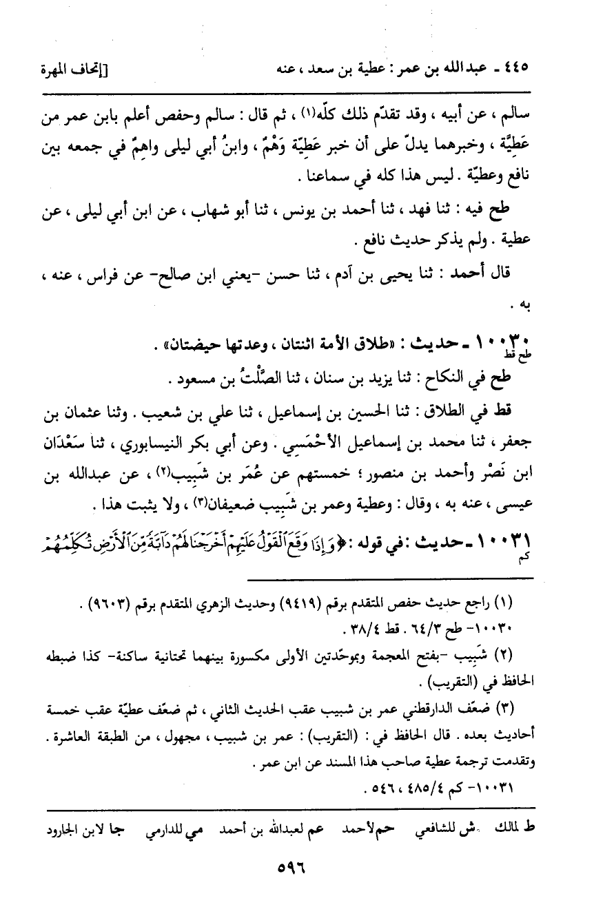 قط فِي الطَّلاقِ: ثنا الْحُسَيْنُ بْنُ إِسْمَاعِيلَ، ثنا عَلِيُّ بْنُ شُعَيْبٍ. وَثنا عُثْمَانُ بْنُ جَعْفَرٍ، ثنا مُحَمَّدُ بْنُ إِسْمَاعِيلَ الأَحْمَسِيُّ. وَعَنْ أَبِي بَكْرٍ النَّيْسَابُورِيِّ، ثنا سَعْدَانُ بْنُ نَصْرٍ، وَأَحْمَدُ بْنُ مَنْصُورٍ؛ خَمْسَتُهُمْ عَنْ عُمَرَ بْنِ شَبِيبٍ، عَنْ عَبْدِ اللَّهِ بْنِ عِيسَى، عَنْهُ، بِهِ. وَقَالَ: وَعَطِيَّةُ وَعُمَرُ بْنُ شَبِيبٍ ضَعِيفَانِ، وَلا يَثْبُتُ هَذَا.