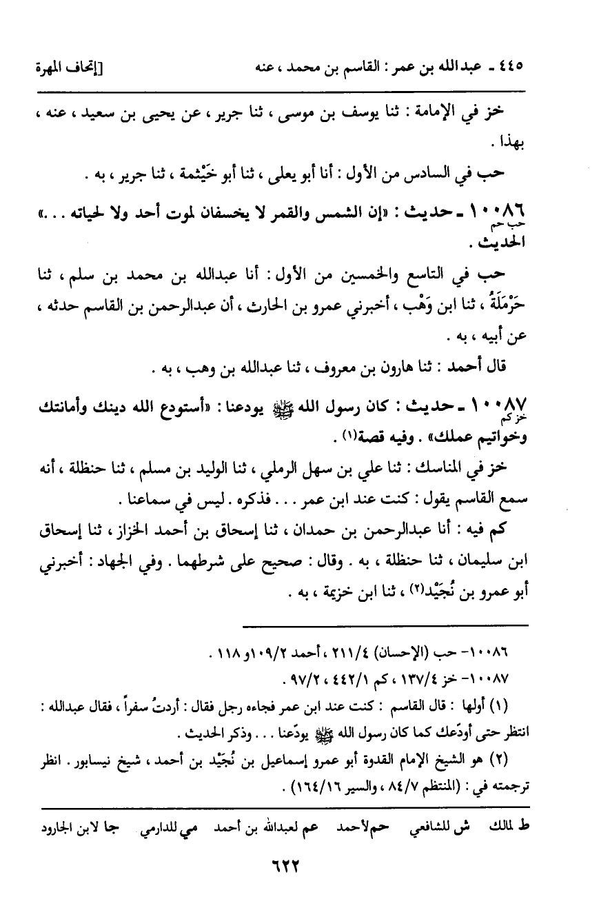 حب فِي التَّاسِعِ وَالْخَمْسِينَ مِنَ الأَوَّلِ: أنا عَبْدُ اللَّهِ بْنُ مُحَمَّدِ بْنِ سَلْمٍ، ثنا حَرْمَلَةُ، ثنا ابْنُ وَهْبٍ، أَخْبَرَنِي عَمْرُو بْنُ الْحَارِثِ، أَنَّ عَبْدَ الرَّحْمَنِ بْنَ الْقَاسِمِ حَدَّثَهُ، عَنْ أَبِيهِ، بِهِ.