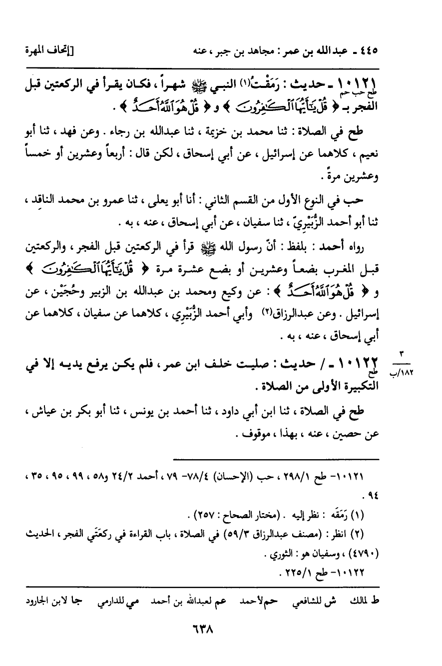 رَوَاهُ أَحْمَدُ: بِلَفْظِ: أَنَّ رَسُولَ اللَّهِ صَلَّى اللَّهُ عَلَيْهِ وَسَلَّمَ قَرَأَ فِي الرَّكْعَتَيْنِ قَبْلَ الْفَجْرِ، وَالرَّكْعَتَيْنِ قَبْلَ الْمَغْرِبِ بِضْعًا وَعِشْرِينَ أَوْ بِضْعَ عَشْرَةَ مَرَّةً قُلْ يَأَيُّهَا الْكَافِرُونَ وقُلْ هُوَ اللَّهُ أَحَدٌ: عَنْ وَكِيعٍ وَمُحَمَّدِ بْنِ عَبْدِ اللَّهِ بْنِ الزُّبَيْرِ وَحُجَيْنٍ، عَنْ إِسْرَائِيلَ. وَعَنْ عَبْدِ الرَّزَّاقِ، وَأَبِي أَحْمَدَ الزُّبَيْرِيِّ، كِلاهُمَا عَنْ سُفْيَانَ، كِلاهُمَا عَنْ أَبِي إِسْحَاقَ، عَنْهُ، بِهِ.