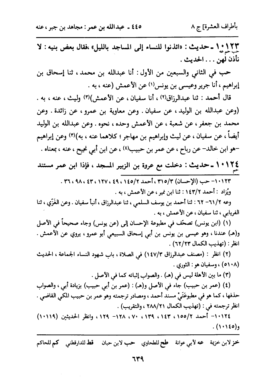10123 - حَدِيثُ حب حم: " ائْذَنُوا لِلنِّسَاءِ إِلَى الْمَسَاجِدِ بِاللَّيْلِ "، فَقَالَ بَعْضُ بَنِيهِ: لا نَأْذَنُ لَهُمْ. . . " الْحَدِيثَ.