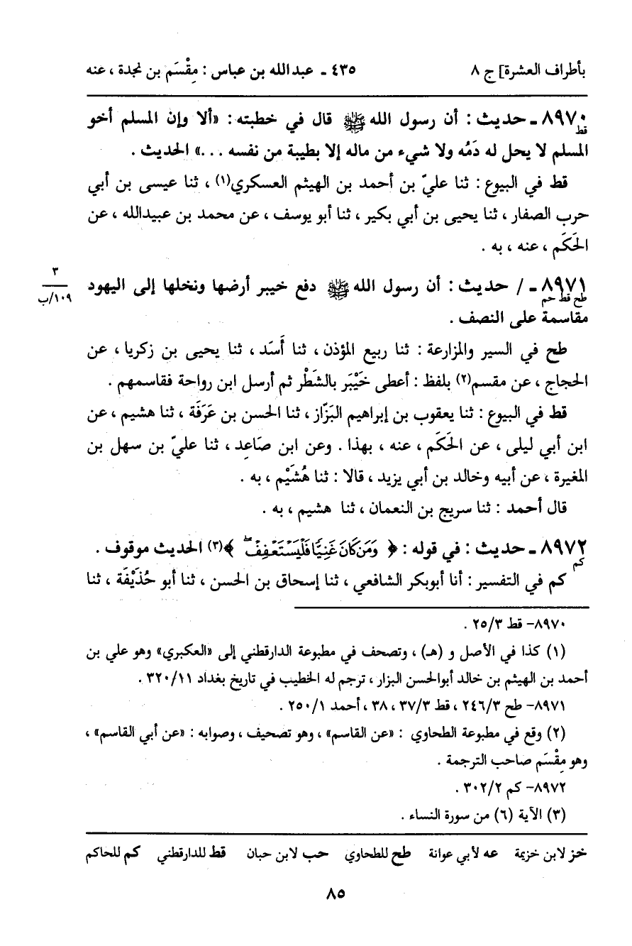 8971 - حَدِيثُ قط حم: " أَنَّ رَسُولَ اللَّهِ صَلَّى اللَّهُ عَلَيْهِ وَسَلَّمَ دَفَعَ خَيْبَرَ أَرْضَهَا وَنَخْلَهَا إِلَى الْيَهُودِ مُقَاسَمَةً عَلَى النِّصْفِ " الْحَدِيثَ.
