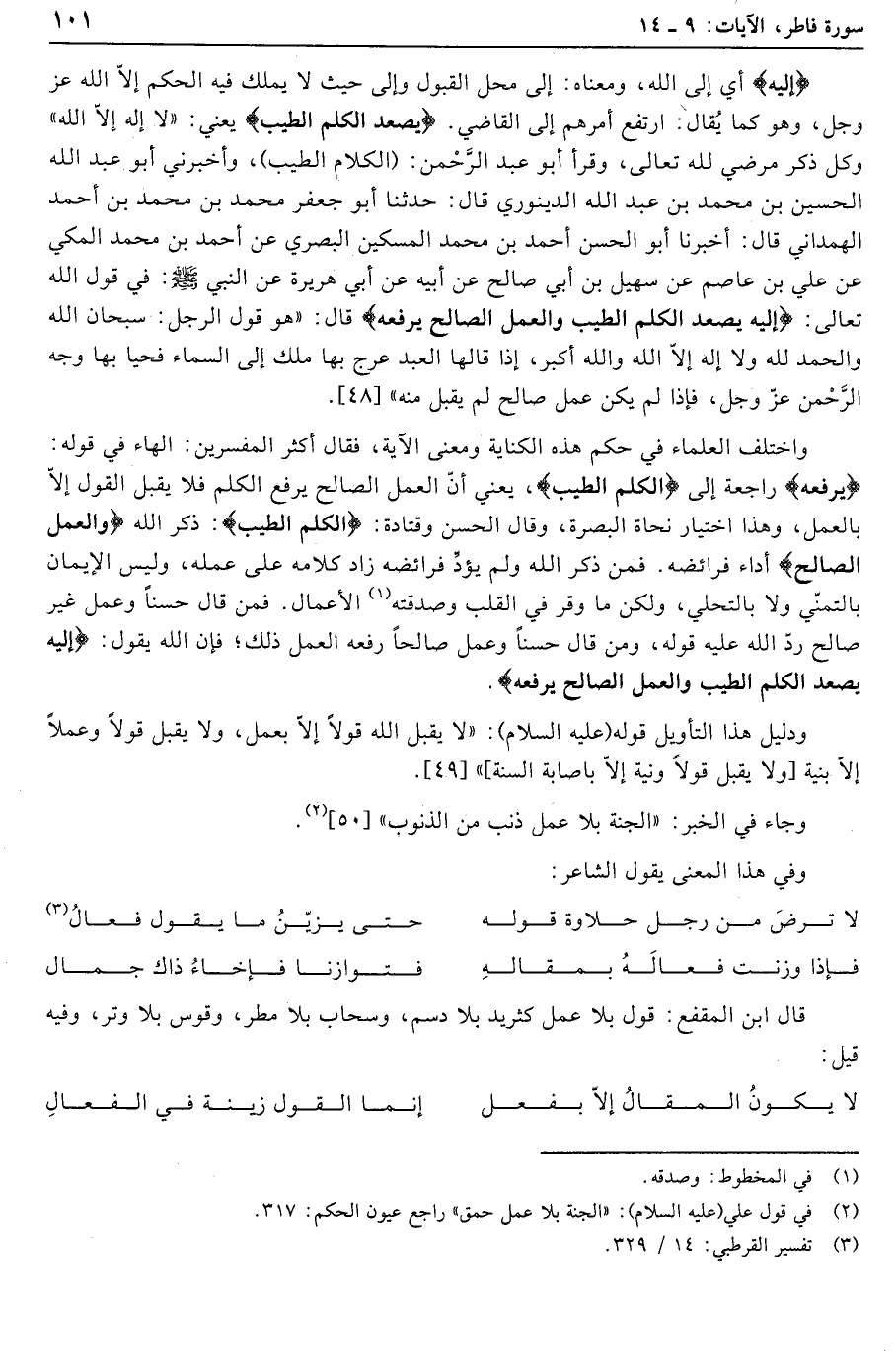 وأخبرني أبو عبد الله الحسين بن محمد بن عبد الله الدينوري قال: حدثنا أبو جعفر محمد بن محمد بن أحمد الهمداني قال: أخبرنا أبو الحسن أحمد بن محمد المسكين البصري عن أحمد بن محمد المكي عن علي بن عاصم عن سهيل بن أبي صالح عن أبيه عن أبي هريرة عن النبي صلّى الله عليه وسلم: في قول الله تعالى: إِلَيْهِ يَصْعَدُ الْكَلِمُ الطَّيِّبُ وَالْعَمَلُ الصَّالِحُ يَرْفَعُهُ قال: «هو قول الرجل: سبحان الله والحمد لله ولا إله إلّا الله والله أكبر، إذا قالها العبد عرج بها ملك إلى السماء فحيا بها وجه الرّحمن عزّ وجل، فإذا لم يكن عمل صالح لم يقبل منه» [48] .