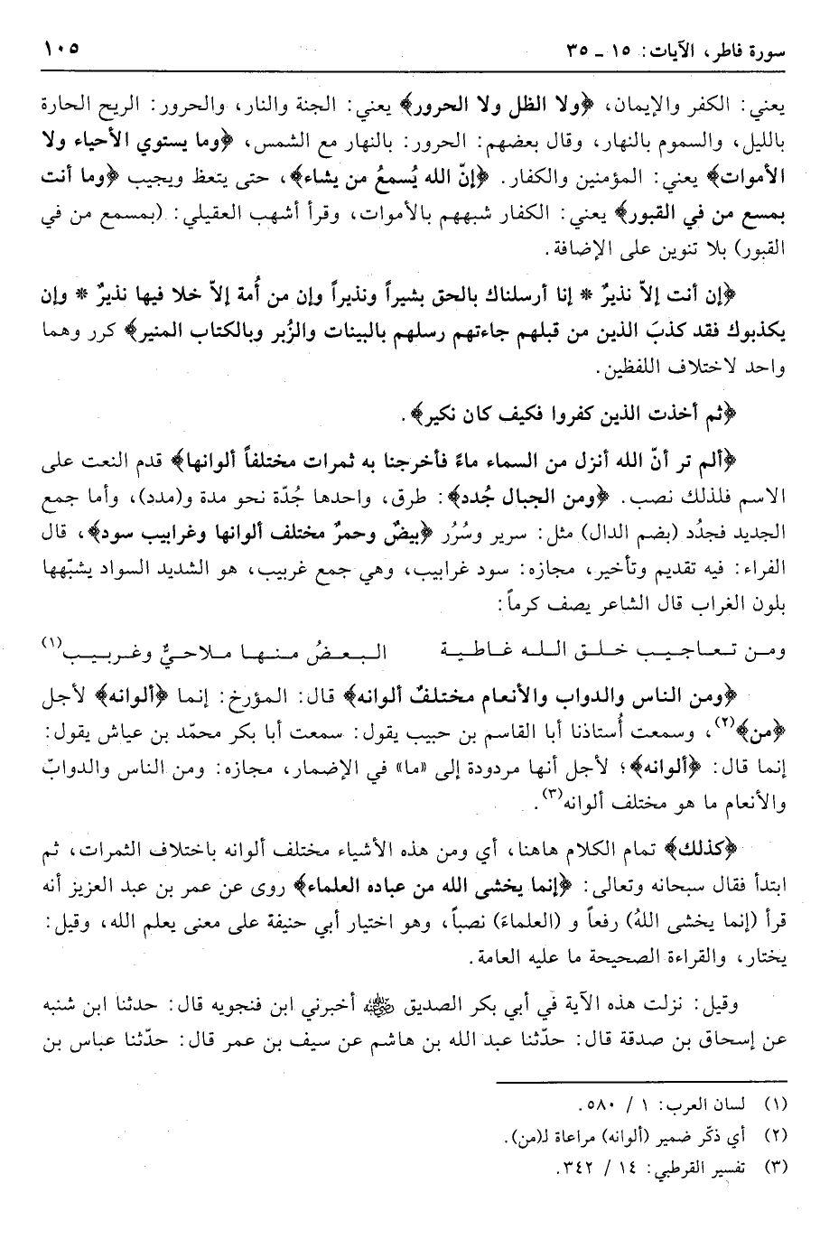 أَلَمْ تَرَ أَنَّ اللَّهَ أَنْزَلَ مِنَ السَّماءِ ماءً فَأَخْرَجْنا بِهِ ثَمَراتٍ مُخْتَلِفاً أَلْوانُها قدم النعت على الاسم فلذلك نصب. وَمِنَ الْجِبالِ جُدَدٌ: طرق، واحدها جدّة نحو مدة و (مدد) ، وأما جمع الجديد فجدد (بضم الدال) مثل: سرير وسرر بِيضٌ وَحُمْرٌ مُخْتَلِفٌ أَلْوانُها وَغَرابِيبُ سُودٌ، قال الفراء: فيه تقديم وتأخير، مجازه: سود غرابيب، وهي جمع غربيب، هو الشديد السواد يشبّهها بلون الغراب قال الشاعر يصف كرما:
