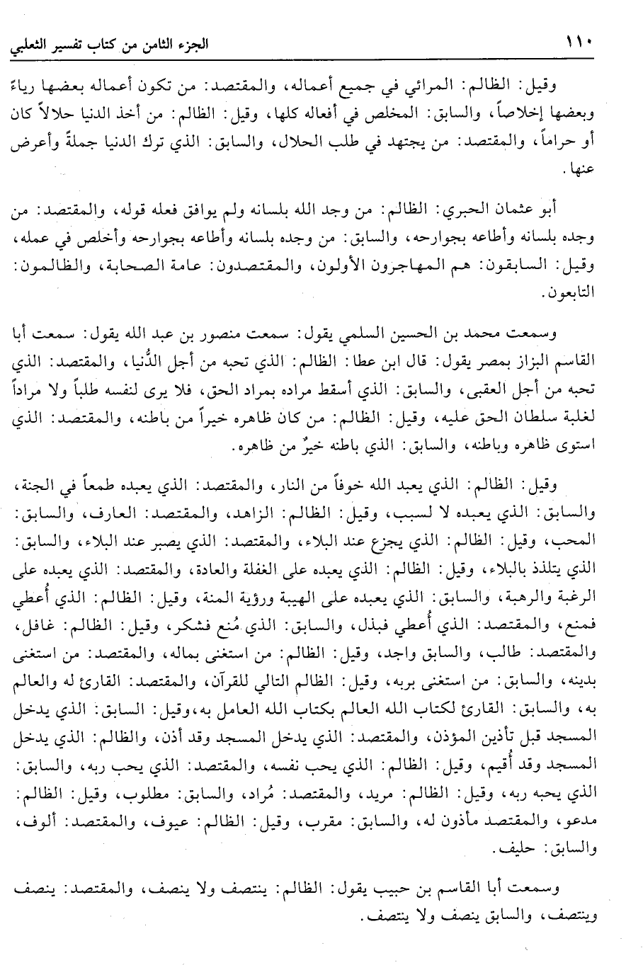 الذي يتلذذ بالبلاء، وقيل: الظالم: الذي يعبده على الغفلة والعادة، والمقتصد: الذي يعبده على الرغبة والرهبة، والسابق: الذي يعبده على الهيبة ورؤية المنة، وقيل: الظالم: الذي أعطي فمنع، والمقتصد: الذي أعطي فبذل، والسابق: الذي منع فشكر، وقيل: الظالم: غافل، والمقتصد: طالب، والسابق واجد، وقيل: الظالم: من استغنى بماله، والمقتصد: من استغنى بدينه، والسابق: من استغنى بربه، وقيل: الظالم التالي للقرآن، والمقتصد: القارئ له والعالم به، والسابق: القارئ لكتاب الله العالم بكتاب الله العامل به، وقيل: السابق: الذي يدخل المسجد قبل تأذين المؤذن، والمقتصد: الذي يدخل المسجد وقد أذن، والظالم: الذي يدخل المسجد وقد أقيم، وقيل: الظالم: الذي يحب نفسه، والمقتصد: الذي يحب ربه، والسابق: